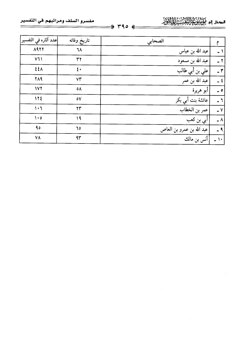 م الصحابي تاريخ وفاته عدد آثاره في التفسير١ عبد اللَّه بن عباس ٦٨ ٨٩٢٢٢ عبد اللَّه بن مسعود ٣٢ ٧٦١٣ علي بن أبي طالب ٤٠ ٤٤٨٤ عبد اللَّه بن عمر ٧٣ ٢٨٩٥ أبو هريرة ٥٨ ١٧٢٦ عائشة بنت أبي بكر ٥٧ ١٢٤٧ عمر بن الخطاب ٢٣ ١٠٦٨ أبي بن كعب ١٩ ١٠٥٩ عبد اللَّه بن عمرو بن العاص ٦٥ ٩٥١٠ أنس بن مالك ٩٣ ٧٨