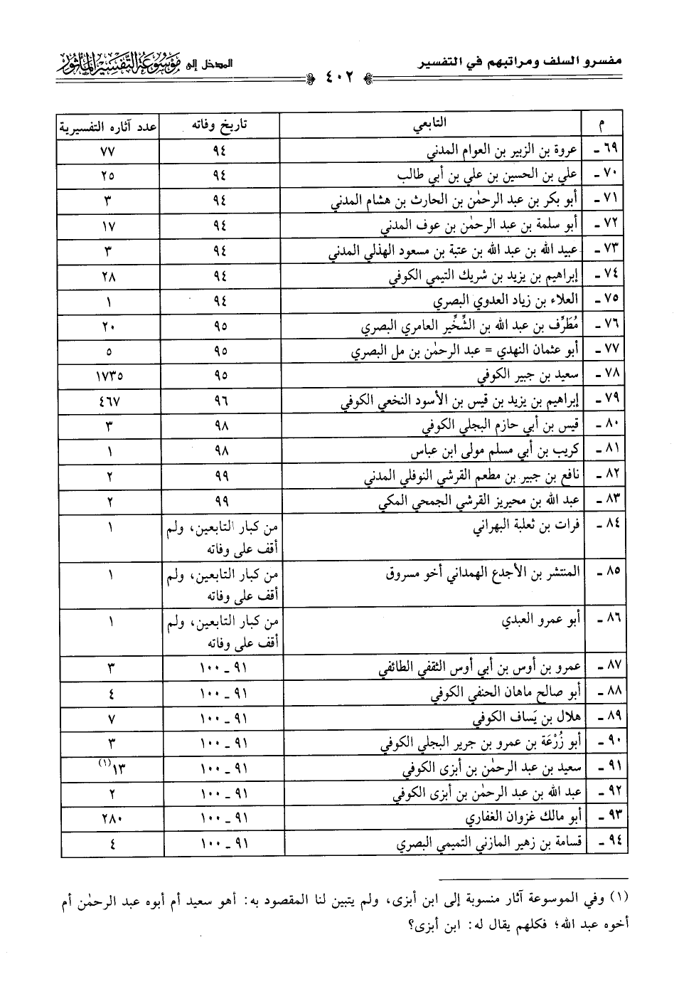 م التابعي تاريخ وفاته عدد آثاره التفسيرية٦٩ عروة بن الزبير بن العوام المدني ٩٤ ٧٧٧٠ على بن الحسين بن علي بن أبي طالب ٩٤ ٢٥٧١ أبو بكر بن عبد الرحمن بن الحارث بن هشام المدني ٩٤ ٣٧٢ أبو سلمة بن عبد الرحمن بن عوف المدني ٩٤ ١٧٧٣ عبيد اللَّه بن عبد اللَّه بن عتبة بن مسعود الهذلي المدني ٩٤ ٣٧٤ إبراهيم بن يزيد بن شريك التيمي الكوفي ٩٤ ٢٨٧٥ العلاء بن زياد العدوي البصري ٩٤ ١٧٦ مُطَرِّف بن عبد اللَّه بن الشِّخِّير العامري البصري ٩٥ ٢٠٧٧ أبو عثمان النهدي = عبد الرحمن بن مل البصري ٩٥ ٥٧٨ سعيد بن جبير الكوفي ٩٥ ١٧٣٥٧٩ إبراهيم بن يزيد بن قيس بن الأسود النخعي الكوفي ٩٦ ٤٦٧٨٠ قيس بن أبي حازم البجلي الكوفي ٩٨ ٣ ٨١ كريب بن أبي مولى ابن عباس ٩٨ ١٨٢ نافع بن جبير بن القرشي النوفلي المدني ٩٩ ٢٨٣ عبد اللَّه بن محيريز القرشي الجمحي المكي ٩٩ ٢٨٤ فرات بن ثعلبة البهراني من كبار التابعين, ولم أقف على وفاته ١٨٥ المنتشر بن الأجدع الهمداني أخو مسروق من كبار التابعين, ولم أقف على وفاته ١٨٦ أبو عمرو العبدي من كبار التابعين, ولم أقف على وفاته ١٨٧ عمرو بن أوس بن أبي أوس الثقفي الطائفي ٩١ - ١٠٠ ٣٨٨ أبو صالح ماهان الحنفي الكوفي ٩١ - ١٠٠ ٤٨٩ هلال بن يَساف الكوفي ٩١ - ١٠٠ ٧٩٠ أبو زُرْعَة بن عمرو بن جرير البجلي الكوفي ٩١ - ١٠٠ ٣٩١ سعيد بن عبد الرحمن بن أبزى الكوفي ٩١ - ١٠٠ ١٣ (¬١)٩٢ عبد اللَّه بن عبد الرحمن بن أبزى الكوفي ٩١ - ١٠٠ ٢٩٣ أبو مالك غزوان الغفاري ٩١ - ١٠٠ ٢٨٠٩٤ قسامة بن زهير المازني التميمي البصري ٩١ - ١٠٠ ٤