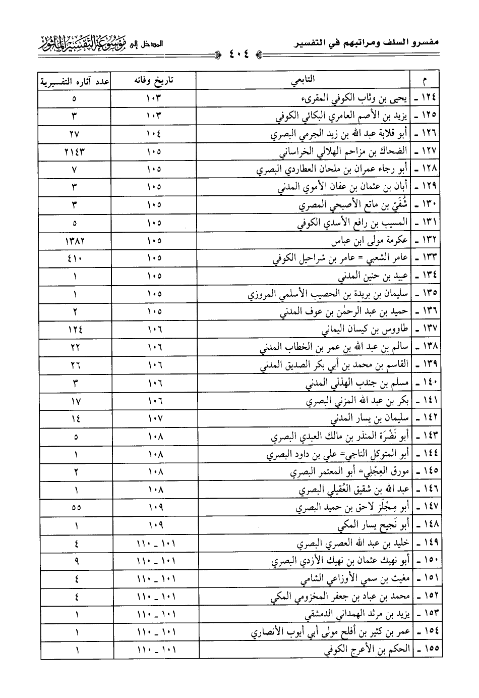 م التابعي تاريخ وفاته عدد آثاره التفسيرية١٢٤ يحيى بن وثاب الكوفي المقرئ ١٠٣ ٥١٢٥ يزيد بن اللَّه العامري البكائي الكوفي ١٠٣ ٣١٢٦ أبو قلابة عبد اللَّه بن زيد الجرمي البصري ١٠٤ ٢٧١٢٧ الضحاك بن مزاحم الهلالي الخراساني ١٠٥ ٢١٤٣١٢٨ أبو رجاء عمران بن ملحان العطاردي البصري ١٠٥ ٧١٢٩ أبان بن عثمان بن عفان الأموي المدني ١٠٥ ٣١٣٠ شُفَيّ بن ماتع الأصبحي المصري ١٠٥ ٣١٣١ المسيب بن رافع الأسدي الكوفي ١٠٥ ٥١٣٢ عكرمة مولى ابن عباس ١٠٥ ١٣٨٢١٣٣ عامر الشعبي = عامر بن شراحيل الكوفي ١٠٥ ٤١٠١٣٤ عبيد بن حنين المدني ١٠٥ ١١٣٥ سليمان بن بريدة بن الحصيب الأسلمي المروزي ١٠٥ ١١٣٦ حميد بن عبد الرحمن بن عوف المدني ١٠٥ ٢١٣٧ طاووس بن كيسان اليماني ١٠٦ ١٢٤١٣٨ سالم بن عبد اللَّه بن عمر بن الخطاب المدني ١٠٦ ٢٢١٣٩ القاسم بن محمد بن أبي بكر الصديق المدني ١٠٦ ٢٦١٤٠ مسلم بن جندب الهذلي المدني ١٠٦ ٣١٤١ بكر بن عبد اللَّه المزني البصري ١٠٦ ١٧١٤٢ سليمان بن يسار المدني ١٠٧ ١٤١٤٣ أبو نَضْرَة المنذر بن مالك العبدي البصري ١٠٨ ٥١٤٤ أبو المتوكل الناجي = علي بن داود البصري ١٠٨ ١١٤٥ مورق العِجْلِي = أبو المعتمر البصري ١٠٨ ٢١٤٦ عبد اللَّه بن شقيق العُقيلي البصري ١٠٨ ١١٤٧ أبو مِجْلَز لاحق بن حميد البصري ١٠٩ ٥٥١٤٨ أبو نَجيح يسار المكي ١٠٩ ١١٤٩ خليد بن عبد اللَّه العصري البصري ١٠١ - ١١٠ ٤١٥٠ أبو نهيك عثمان بن نهيك الأزدي البصري ١٠١ - ١١٠ ٩١٥١ مغيث بن سمي الأوزاعي الشامي ١٠١ - ١١٠ ٩١٥٢ محمد بن عباد بن جعفر المخزومي المكي ١٠١ - ١١٠ ٩١٥٣ يزيد بن مرثد الهمداني الدمشقي ١٠١ - ١١٠ ١١٥٤ عمر بن كثير بن أفلح مولى أبي أيوب الأنصاري ١٠١ - ١١٠ ١١٥٥ الحكم بن الأعرج الكوفي ١٠١ - ١١٠ ١