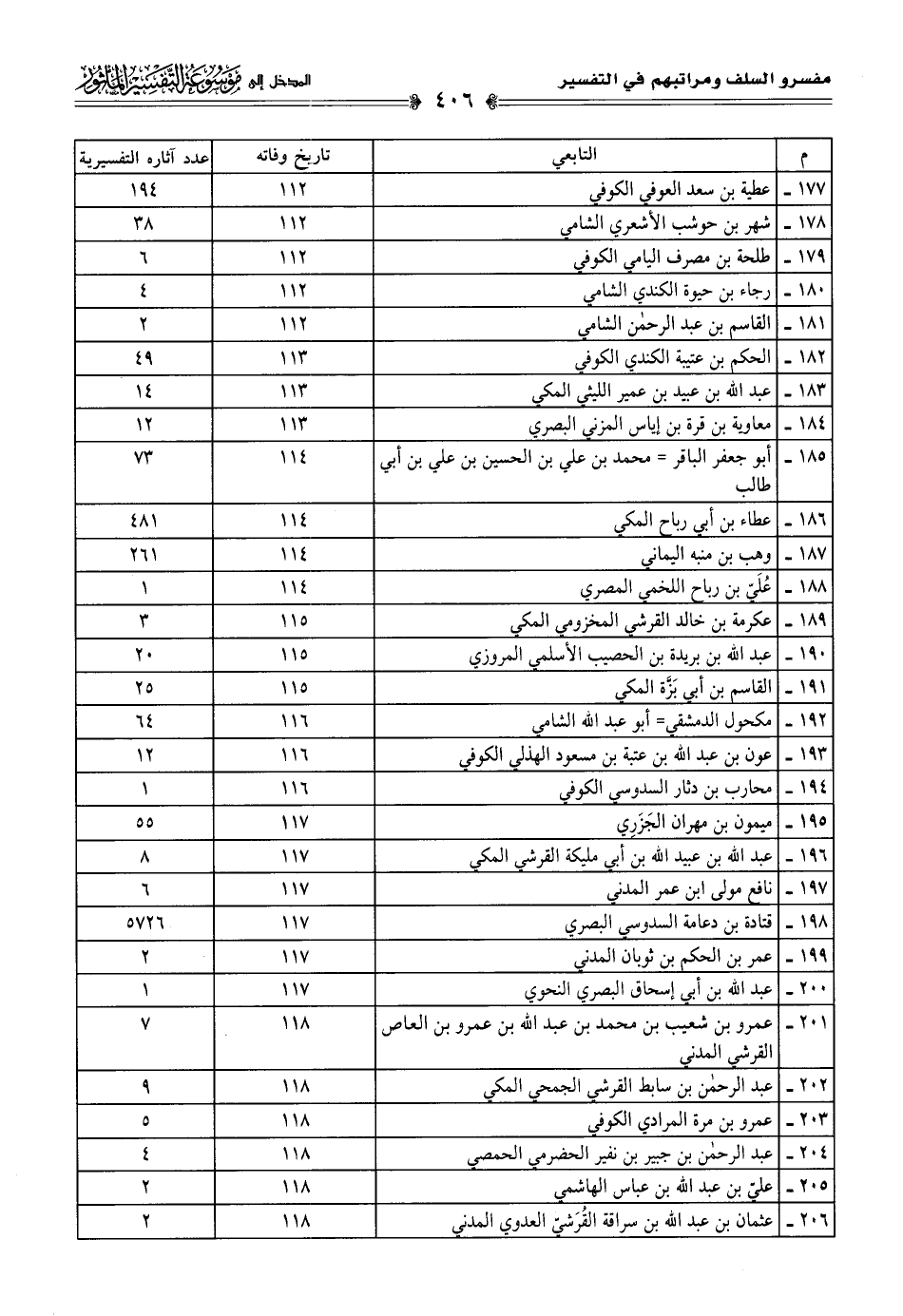 م التابعي تاريخ وفاته عدد آثاره التفسيرية١٧٧ عطية بن سعد العوفي الكوفي ١١٢ ١٩٤١٧٨ شهر بن حوشب الأشعري الشامي ١١٢ ٣٨١٧٩ طلحة بن مصرف اليامي الكوفي ١١٢ ٦١٨٠ رجاء بن حيوة الكندي الشامي ١١٢ ٤١٨١ القاسم بن عبد الرحمن الشامي ١١٢ ٢١٨٢ الحكم بن عتيبة الكندي الكوفي ١١٣ ٤٩١٨٣ عبد اللَّه بن عبيد بن عمير الليثي المكي ١١٣ ١٤١٨٤ معاوية بن قرة بن إياس المزني البصري ١١٣ ١٢١٨٥ أبو جعفر الباقر = محمد بن علي بن الحسين بن علي بن أبي طالب ١١٤ ٧٣١٨٦ عطاء بن أبي رباح المكي ١١٤ ٤٨١١٨٧ وهب بن منبه اليماني ١١٤ ٢٦١١٨٨ عُلَيّ بن رباح اللخمي المصري ١١٤ ١١٨٩ عكرمة بن خالد القرشي المخزومي المكي ١١٥ ٣١٩٠ عبد اللَّه بن بريدة بن الحصيب الأسلمي المروزي ١١٥ ٢٠١٩١ القاسم بن أبي بَزَّة المكي ١١٥ ٢٥١٩٢ مكحول الدمشقي = أبو عبد اللَّه الشامي ١١٦ ٦٤١٩٣ عون بن عبد اللَّه بن عتبة بن مسعود الهذلي الكوفي ١١٦ ١٢١٩٤ محارب بن دثار السدوسي الكوفي ١١٦ ١١٩٥ ميمون بن مهران الجَزَرِي ١١٧ ٥٥١٩٦ عبد اللَّه بن عبيد اللَّه بن أبي مليكة القرشي المكي ١١٧ ٨١٩٧ نافع مولى ابن عمر المدني ١١٧ ٦١٩٨ قتادة بن دعامة السدوسي البصري ١١٧ ٥٧٢٦١٩٩ عمر بن الحكم بن ثوبان المدني ١١١٧ ٢٢٠٠ عبد اللَّه بن أبي إسحاق البصري النحوي ١١٧ ١٢٠١ عمرو بن شعيب بن محمد بن عبد اللَّه بن عمرو بن العاص القرشى المدني ١١٨ ٧٢٠٢ عبد الرحمن بن سابط القرشي الجمحي المكي ١١٨ ٩٢٠٣ عمرو بن مرة المرادي الكوفي ١١٨ ٥٢٠٤ عبد الرحمن بن جبير بن نفير الحضرمي الحمصي ١١٨ ٤٢٠٥ عليّ بن عبد اللَّه بن عباس الهاشمي ١١٨ ٢٢٠٦ عثمان بن عبد اللَّه بن سراقة القُرَشيّ العدوي المدني ١١٨ ٢