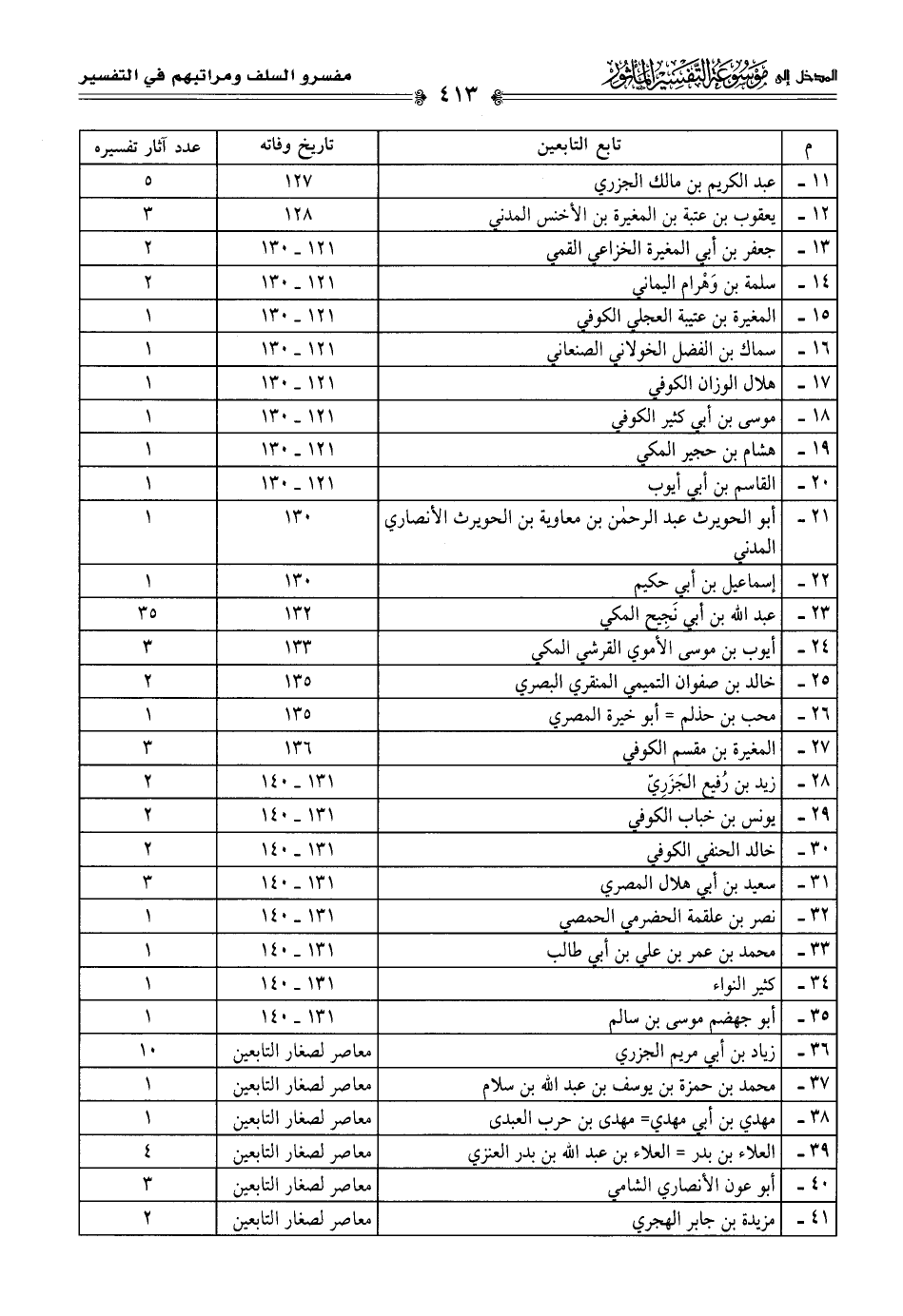 م تابع التابعين تاريخ وفاته عدد آثار تفسيره١١ عبد الكريم بن مالك الجزري ١٢٧ ٥١٢ يعقوب بن عتبة بن المغيرة بن الأخنس المدني ١٢٨ ٣١٣ جعفر بن أبي المغيرة الخزاعي القمي ١٢١ - ١٣٠ ٢١٤ سلمة بن وَهْرام اليماني ١٢١ - ١٣٠ ٢١٥ المغيرة بن عتيبة العجلي الكوفي ١٢١ - ١٣٠ ١١٦ سماك بن الفضل الخولاني الصنعاني ١٢١ - ١٣٠ ١١٧ هلال الوزان الكوفي ١٢١ - ١٣٠ ١١٨ موسى بن أبي كثير الكوفي ١٢١ - ١٣٠ ١١٩ هشام بن حجير المكي ١٢١ - ١٣٠ ١٢٠ القاسم بن أبي أيوب ١٢١ - ١٣٠ ١٢١ أبو الحويرث عبد الرحمن بن معاوية بن الحويرث الأنصاري المدني ١٣٠ ١٢٢ إسماعيل بن أبي حكيم ١٣٠ ١٢٣ عبد اللَّه بن أبي نَجِيح المكي ١٣٢ ٣٥٢٤ أيوب بن موسى الأموي القرشي المكي ١٣٣ ٣٢٥ خالد بن صفوان التميمي المنقري البصري ١٣٥ ٢٢٦ محب بن حذلم = أبو خيرة المصري ١٣٥ ١٢٧ المغيرة بن مقسم الكوفي ١٣١ - ١٤٠ ٢٢٨ زيد بن رُفيع الجَزَرِيّ ١٣١ - ١٤٠ ٢٢٩ يونس بن خباب الكوفي ١٣١ - ١٤٠ ٢٣٠ خالد الحنفي الكوفي ١٣١ - ١٤٠ ٢٣١ سعيد بن أبي هلال المصري ١٣١ - ١٤٠ ٣٣٢ نصر بن علقمة الحضرمي الحمصي ١٣١ - ١٤٠ ١٣٣ محمد بن عمر بن علي بن أبي طالب ١٣١ - ١٤٠ ١٣٤ كثير النواء ١٣١ - ١٤٠ ١٣٥ أبو جهضم موسى بن سالم ١٣١ - ١٤٠ ١٣٦ زياد بن أبي مريم الجزري معاصر لصغار التابعين ١٠٣٧ محمد بن حمزة بن يوسف بن عبد اللَّه بن سلام معاصر لصغار التابعين ١٣٨ مهدي بن أبي مهدي = مهدي بن حرب العبدي معاصر لصغار التابعين ١٣٩ العلاء بن بدر = العلاء بن عبد اللَّه بن بدر العنزي معاصر لصغار التابعين ٤٤٠ أبو عون الأنصاري الشامي معاصر لصغار التابعين ٣٤١ مزيدة بن جابر الهجري معاصر لصغار التابعين ٢