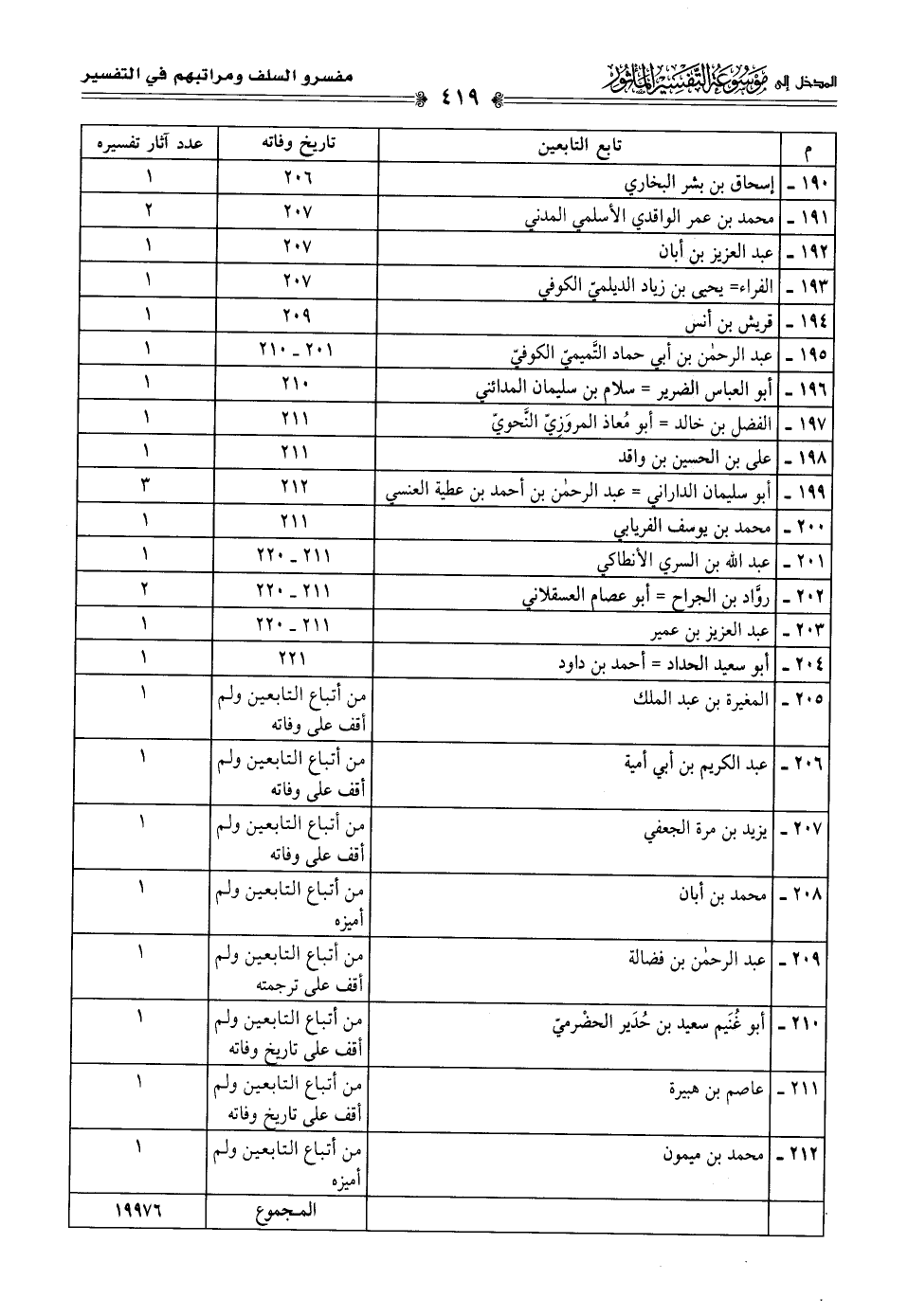 م تابع التابعين تاريخ وفاته عدد آثار تفسيره١٩٠ إسحاق بن بشر البخاري ٢٠٦ ١١٩١ محمد بن عمر الواقدي الأسلمي المدني ٢٠٧ ٢١٩٢ عبد العزيز بن أبان ٢٠٧ ١١٩٣ الفراء = يحيى بن زياد الديلميّ الكوفي ٢٠٧ ١١٩٤ قريش بن أنس ٢٠٩ ١١٩٥ عبد الرحمن بن أبي حماد التَّميميّ الكوفيّ ٢٠١ - ٢١٠ ١١٩٦ أبو العباس الضرير = سلام بن سليمان المدائني ٢١٠ ١١٩٧ الفضل بن خالد = أبو مُعاذ المروَزيّ النَّحويّ ٢١١ ١١٩٨ علي بن الحسين بن واقد ٢١١ ١١٩٩ أبو سليمان الداراني = عبد الرحمن بن أحمد بن عطية العنسي ٢١٢ ٣٢٠٠ محمد بن يوسف الفريابي ٢١١ ١٢٠١ عبد اللَّه بن السري الأنطاكي ٢١١ - ٢٢٠ ١٢٠٢ روَّاد بن الجراح = أبو عصام العسقلاني ٢١١ - ٢٢٠ ٢٢٠٣ عبد العزيز بن عمير ٢١١ - ٢٢٠ ١٢٠٤ أبو سعيد الحداد = أحمد بن داود ٢٢١ ١٢٠٥ المغيرة بن عبد الملك من أتباع التابعين ولم أقف على وفاته ١٢٠٦ عبد الكريم بن أبي أمية من أتباع التابعين ولم أقف على وفاته ١٢٠٧ يزيد بن مرة الجعفي من أتباع التابعين ولم أقف على وفاته ١٢٠٨ محمد بن أبان من أتباع التابعين ولم أميزه ١٢٠٩ عبد الرحمن بن فضالة من أتباع التابعين ولم أقف على ترجمته ١٢١٠ أبو غُنَيم سعيد بن حُدَير الحضْرميّ من أتباع التابعين ولم أقف على تاريخ وفاته ١٢١١ عاصم بن هبيرة من أتباع التابعين ولم أقف على تاريخ وفاته ١٢١٢ محمد بن ميمون من أتباع التابعين ولم أميزه ١.. .. المجموع ١٩٩٧٦