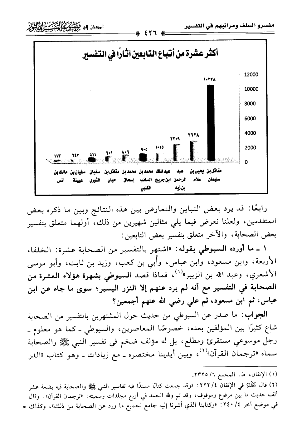 الجواب: ما صدر عن السيوطي من حديث حول المشتهرين بالتفسير من الصحابة شاع كثيرًا بين المؤلفين بعده، خصوصًا المعاصرين، والسيوطي -كما هو معلوم- رجل موسوعي مستقرئ ومطلع، بل له مؤلف ضخم في تفسير النبي -صلى اللَّه عليه وسلم- والصحابة سماه "ترجمان القرآن" (¬٢)، وبين أيدينا مختصره -مع زيادات- وهو كتاب "الدر