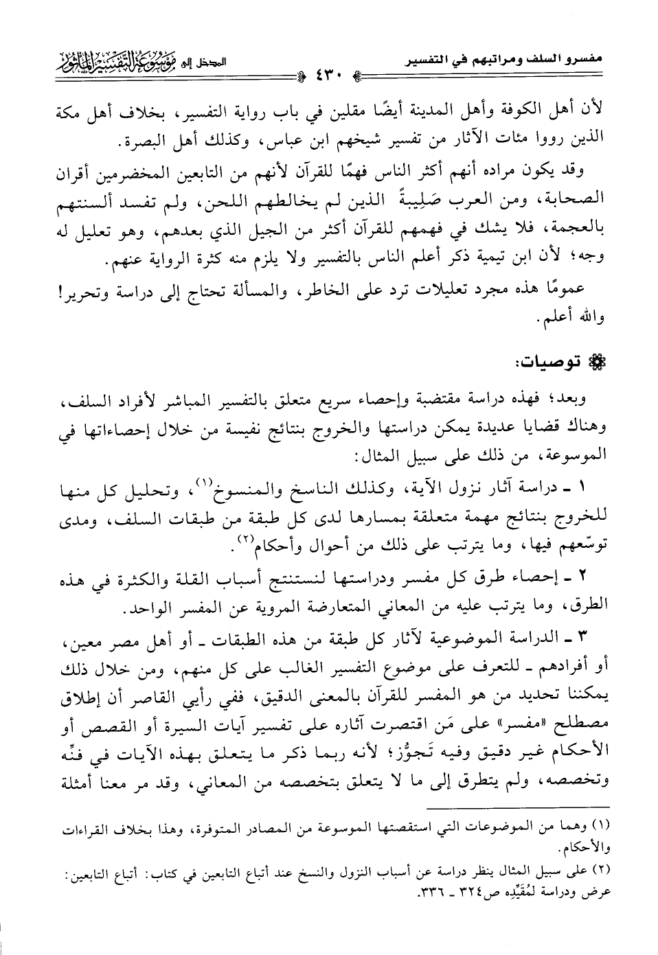 (¬٢) على سبيل المثال ينظر دراسة عن أسباب النزول والنسخ عند أتباع التابعين في كتاب: أتباع التابعين: عرض ودراسة لمُقَيِّدِه ص ٣٢٤ - ٣٣٦.