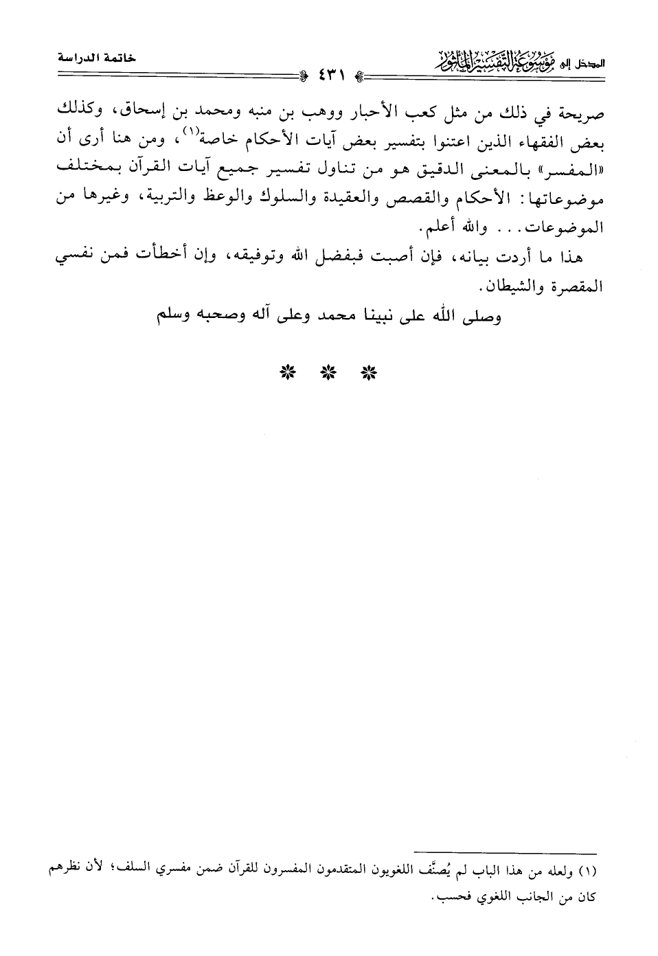 صريحة في ذلك من مثل كعب الأحبار ووهب بن منبه ومحمد بن إسحاق، وكذلك بعض الفقهاء الذين اعتنوا بتفسير بعض آيات الأحكام خاصة (¬١)، ومن هنا أرى أن "المفسر" بالمعنى الدفيق هو من تناول تفسير جميع آيات القرآن بمختلف موضوعاتها: الأحكام والقصص والعقيدة والسلوك والوعظ والتربية، وغيرها من الموضوعات. . . واللَّه أعلم.