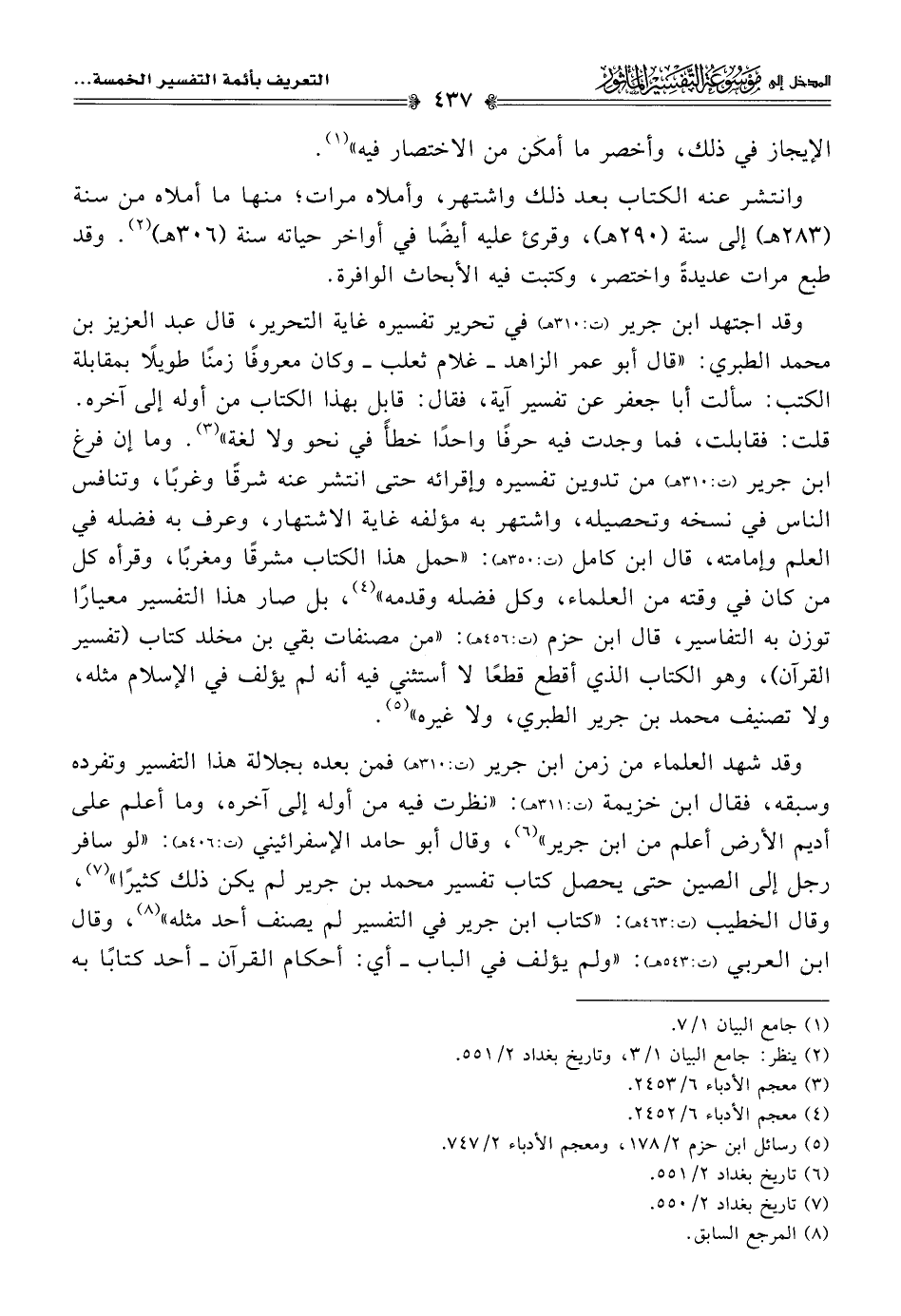 وقد اجتهد ابن جرير (ت: ٣١٠ هـ) في تحرير تفسيره غاية التحرير، قال عبد العزيز بن محمد الطبري: "قال أبو عمر الزاهد -غلام ثعلب- وكان معروفًا زمنًا طويلًا بمقابلة الكتب: سألت أبا جعفر عن تفسير آية، فقال: قابل بهذا الكتاب من أوله إلى آخره. قلت: فقابلت، فما وجدت فيه حرفًا واحدًا خطأً في نحو ولا لغة" (¬٣). وما إن فرغ ابن جرير (ت: ٣١٠ هـ) من تدوين تفسيره وإقرائه حتى انتشر عنه شرقًا وغربًا، وتنافس الناس في نسخه وتحصيله، واشتهر به مؤلفه غاية الاشتهار، وعرف به فضله في العلم وإمامته، قال ابن كامل (ت: ٣٥٠ هـ): "حمل هذا الكتاب مشرقًا ومغربًا، وقرأه كل من كان في وقته من العلماء، وكل فضله وقدمه" (¬٤)، بل صار هذا التفسير معيارًا توزن به التفاسير، قال ابن حزم (ت: ٤٥٦ هـ): "من مصنفات بقي بن مخلد كتاب (تفسير القرآن)، وهو الكتاب الذي أقطع قطعًا لا أستثني فيه أنه لم يؤلف في الإسلام مثله، ولا تصنيف محمد بن جرير الطبري، ولا غيره" (¬٥).