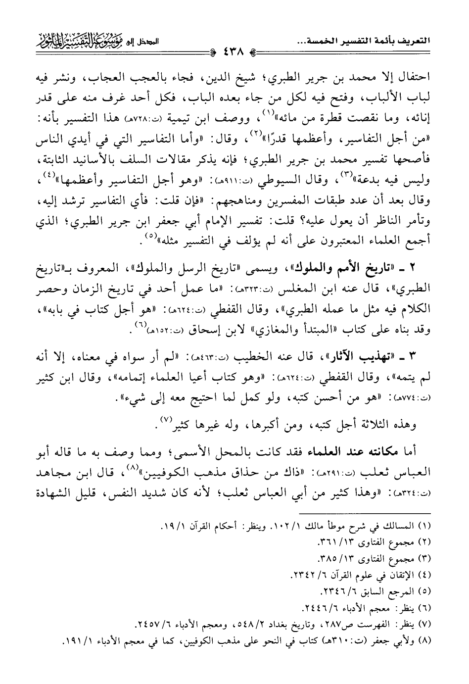 احتفال إِلا محمد بن جرير الطبري؛ شيخ الدين، فجاء بالعجب العجاب، ونشر فيه لباب الألباب، وفتح فيه لكل من جاء بعده الباب، فكل أحد غرف منه على قدر إنائه، وما نقصت قطرة من مائه" (¬١)، ووصف ابن تيمية (ت: ٧٢٨ هـ) هذا التفسير بأنه: "من أجل التفاسير، وأعظمها قدرًا" (¬٢)، وقال: "وأما التفاسير التي في أيدي الناس فأصحها تفسير محمد بن جرير الطبري؛ فإنه يذكر مقالات السلف بالأسانيد الثابتة، وليس فيه بدعة" (¬٣)، وقال السيوطي (ت: ٩١١ هـ): "وهو أجل التفاسير وأعظمها" (¬٤)، وقال بعد أن عدد طبقات المفسرين ومناهجهم: "فإن قلت: فأي التفاسير ترشد إليه، وتأمر الناظر أن يعول عليه؟ قلت: تفسير الإمام أبي جعفر ابن جرير الطبري؛ الذي أجمع العلماء المعتبرون على أنه لم يؤلف في التفسير مثله" (¬٥).