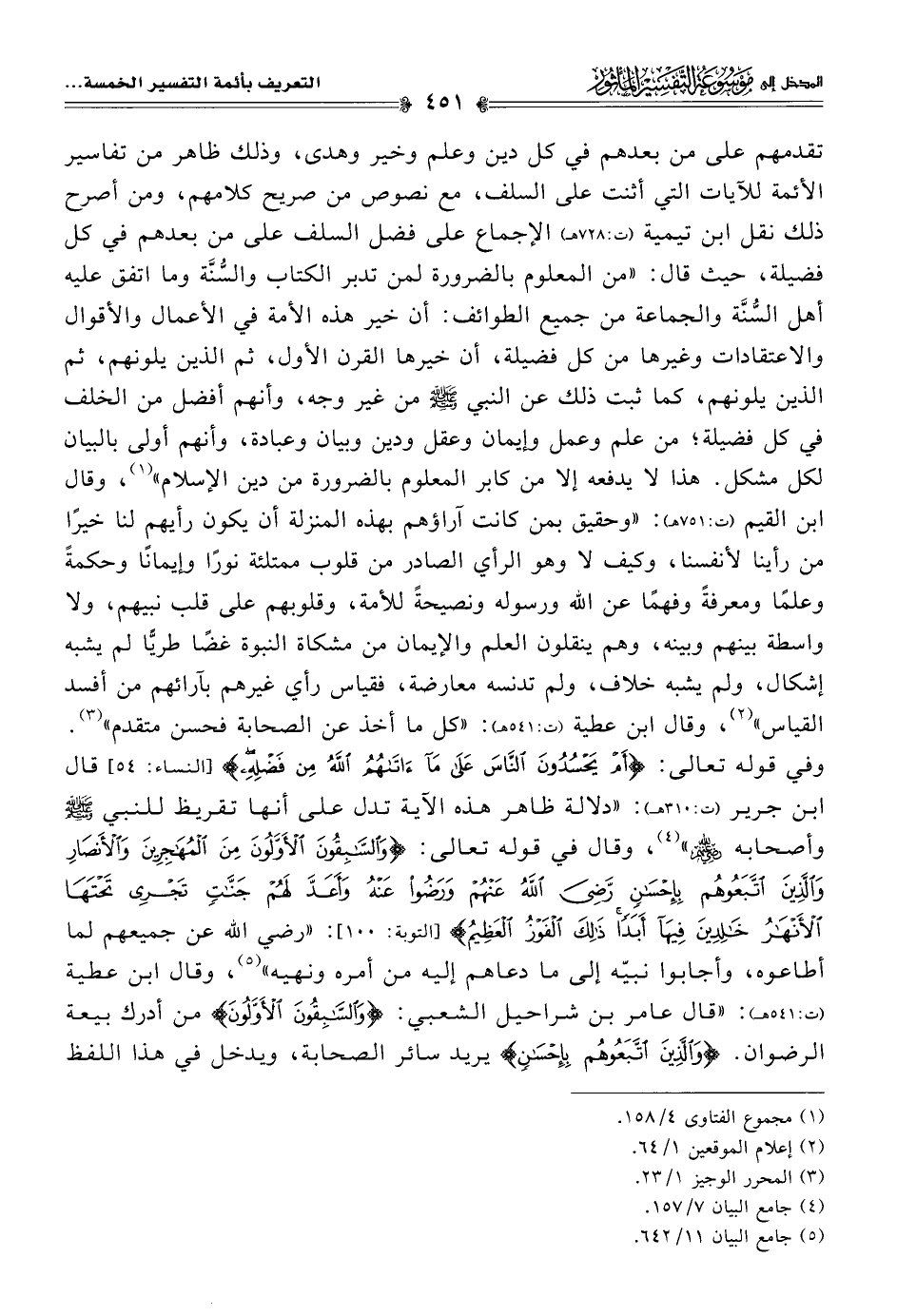 تقدمهم على من بعدهم في كل دين وعلم وخير وهدى، وذلك ظاهر من تفاسير الأئمة للآيات التي أثنت على السلف، مع نصوص من صريح كلامهم، ومن أصرح ذلك نقل ابن تيمية (ت: ٧٢٨ هـ) الإجماع على فضل السلف على من بعدهم في كل فضيلة، حيث قال: "من المعلوم بالضرورة لمن تدبر الكتاب والسُّنَّة وما اتفق عليه أهل السُّنَّة والجماعة من جميع الطوائف: أن خير هذه الأمة في الأعمال والأقوال والاعتقادات وغيرها من كل فضيلة، أن خيرها القرن الأول، ثم الذين يلونهم، ثم الذين يلونهم، كما ثبت ذلك عن النبي -صلى اللَّه عليه وسلم- من غير وجه، وأنهم أفضل من الخلف في كل فضيلة؛ من علم وعمل وإيمان وعقل ودين وبيان وعبادة، وأنهم أولى بالبيان لكل مشكل. هذا لا يدفعه إِلا من كابر المعلوم بالضرورة من دين الإسلام" (¬١)، وقال ابن القيم (ت: ٧٥١ هـ): "وحقيق بمن كانت آراؤهم بهذه المنزلة أن يكون رأيهم لنا خيرًا من رأينا لأنفسنا، وكيف لا وهو الرأي الصادر من قلوب ممتلئة نورًا وإيمانًا وحكمةً وعلمًا ومعرفةً وفهمًا عن اللَّه ورسوله ونصيحةً للأمة، وقلوبهم على قلب نبيهم، ولا واسطة بينهم وبينه، وهم ينقلون العلم والإيمان من مشكاة النبوة غضًا طريًّا لم يشبه إشكال، ولم يشبه خلاف، ولم تدنسه معارضة، فقياس رأي غيرهم بآرائهم من أفسد القياس" (¬٢)، وقال ابن عطية (ت: ٥٤١ هـ): "كل ما أخذ عن الصحابة فحسن متقدم" (¬٣). وفي قوله تعالى: {أَمْ يَحْسُدُونَ النَّاسَ عَلَى مَا آتَاهُمُ اللَّهُ مِنْ فَضْلِهِ} [النساء: ٥٤] قال ابن جرير (ت: ٣١٠ هـ): "دلالة ظاهر هذه الآية تدل على أنها تقريظ للنبي -صلى اللَّه عليه وسلم- وأصحابه -رضي اللَّه عنهم-" (¬٤)، وقال في قوله تعالى: {وَالسَّابِقُونَ الْأَوَّلُونَ مِنَ الْمُهَاجِرِينَ وَالْأَنْصَارِ وَالَّذِينَ اتَّبَعُوهُمْ بِإِحْسَانٍ رَضِيَ اللَّهُ عَنْهُمْ وَرَضُوا عَنْهُ وَأَعَدَّ لَهُمْ جَنَّاتٍ تَجْرِي تَحْتَهَا الْأَنْهَارُ خَالِدِينَ فِيهَا أَبَدًا ذَلِكَ الْفَوْزُ الْعَظِيمُ} [التوبة: ١٠٠]: "رضي اللَّه عن جميعهم لما أطاعوه، وأجابوا نبيّه إلى ما دعاهم إليه من أمره ونهيه" (¬٥)، وقال ابن عطية (ت: ٥٤١ هـ): "قال عامر بن شراحيل الشعبي: {وَالسَّابِقُونَ الْأَوَّلُونَ} من أدرك بيعة الرضوان. {وَالَّذِينَ اتَّبَعُوهُمْ بِإِحْسَانٍ} يريد سائر الصحابة، ويدخل في هذا اللفظ