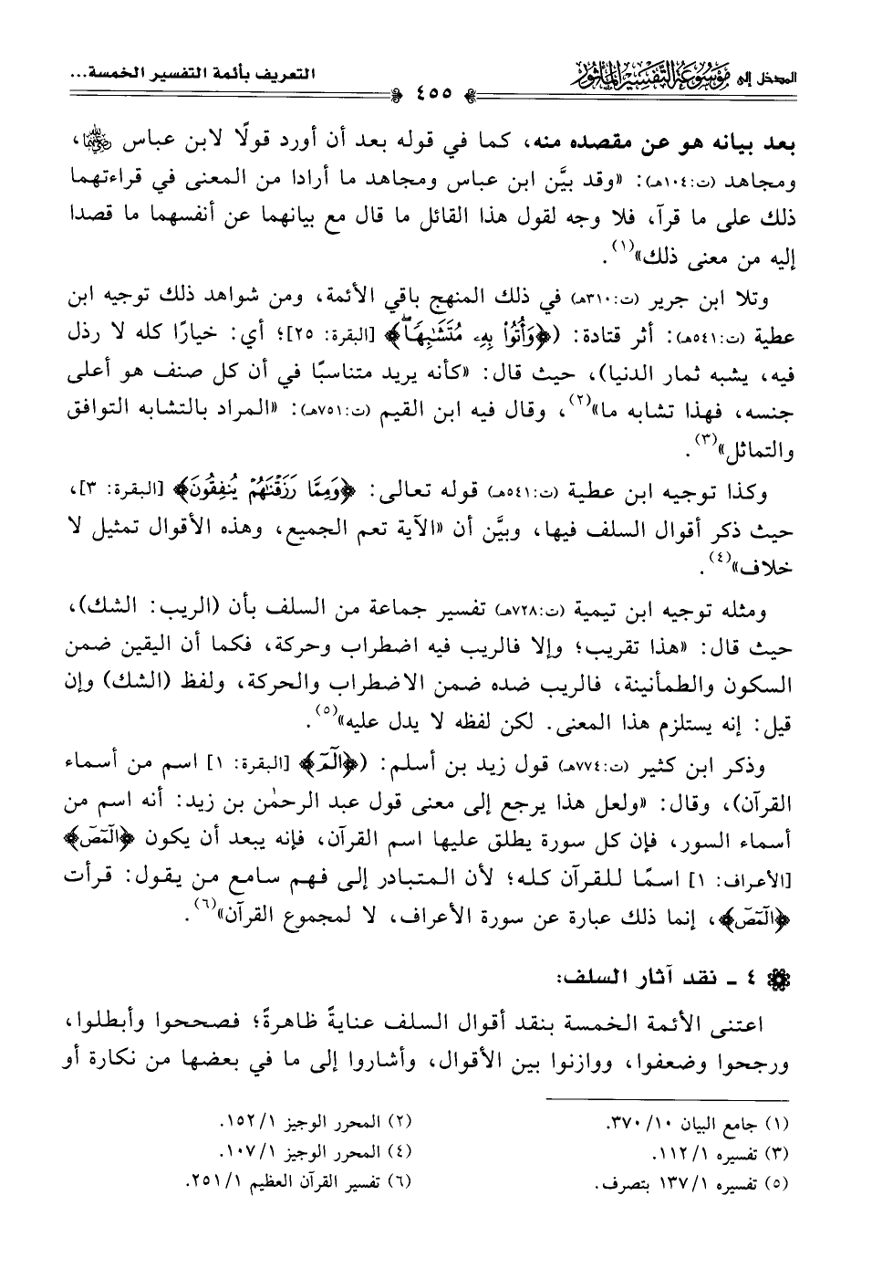 وتلا ابن جرير (ت: ٣١٠ هـ) في ذلك المنهج باقي الأئمة، ومن شواهد ذلك توجيه ابن عطية (ت: ٥٤١ هـ): أثر قتادة: ({وَأُتُوا بِهِ مُتَشَابِهًا} [البقرة: ٢٥]؛ أي: خيارًا كله لا رذل فيه، يشبه ثمار الدنيا)، حيث قال: "كأنه يريد متناسبًا في أن كل صنف هو أعلى جنسه، فهذا تشابه ما" (¬٢)، وقال فيه ابن القيم (ت: ٧٥١ هـ): "المراد بالتشابه التوافق والتماثل" (¬٣).
