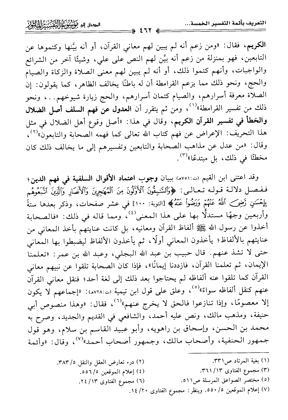 وقد اعتنى ابن القيم (ت: ٧٥١ هـ) ببيان وجوب اعتماد الأقوال السلفية في فهم الدين، ففصل دلالة قوله تعالى: {وَالسَّابِقُونَ الْأَوَّلُونَ مِنَ الْمُهَاجِرِينَ وَالْأَنْصَارِ وَالَّذِينَ اتَّبَعُوهُمْ بِإِحْسَانٍ رَضِيَ اللَّهُ عَنْهُمْ وَرَضُوا عَنْهُ} [التوبة: ١٠٠] في عشر صفحات، وذكر بعدها ستةً وأربعين وجهًا مستدلّا بها على هذا المعنى (¬٤)، ومما قاله في ذلك: "فالصحابة أخذوا عن رسول اللَّه -صلى اللَّه عليه وسلم- ألفاظ القرآن ومعانيه، بل كانت عنايتهم بأخذ المعاني من عنايتهم بالألفاظ؛ يأخذون المعاني أولًا، ثم يأخذون الألفاظ ليضبطوا بها المعاني حتى لا تشذ عنهم. قال حبيب بن عبد اللَّه البجلي، وعبد اللَّه بن عمر: "تعلمنا الإيمان، ثم تعلمنا القرآن، فازددنا إيمانًا"، فإذا كان الصحابة تلقوا عن نبيهم معاني القرآن كما تلقوا عنه ألفاظه لم يحتاجوا بعد ذلك إلى لغة أحد؛ فنقل معاني القرآن عنهم كنقل ألفاظه سواءً" (¬٥)، وعلق على قول ابن تيمية (ت: ٧٢٨ هـ): "إجماعهم لا يكون إِلَّا معصومًا، وإذا تنازعوا فالحق لا يخرج عنهم" (¬٦)، فقال: "وهذا منصوص أبي حنيفة، ومذهب مالك، ونص عليه أحمد، والشافعي في القديم والجديد، وصرح به محمد بن الحسن، وإسحاق بن راهويه، وأبو عبيد القاسم بن سلام، وهو قول جمهور الحنفية، وأصحاب مالك، وجمهور أصحاب أحمد" (¬٧)، وقال: "وأئمة