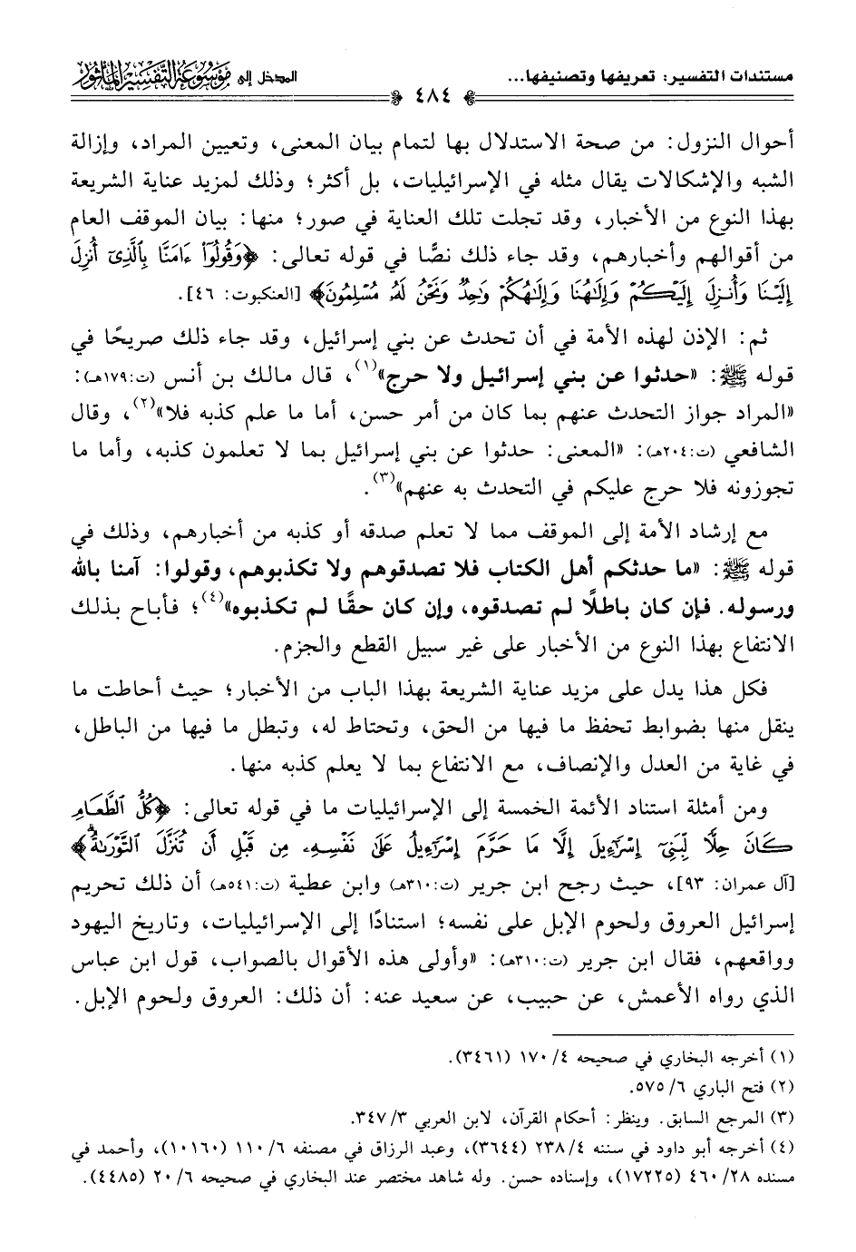 أحوال النزول: من صحة الاستدلال بها لتمام بيان المعنى، وتعيين المراد، وإزالة الشبه والإشكالات يقال مثله في الإسرائيليات، بل أكثر؛ وذلك لمزيد عناية الشريعة بهذا النوع من الأخبار، وقد تجلت تلك العناية في صور؛ منها: بيان الموقف العام من أقوالهم وأخبارهم، وقد جاء ذلك نصًّا في قوله تعالى: {وَقُولُوا آمَنَّا بِالَّذِي أُنْزِلَ إِلَيْنَا وَأُنْزِلَ إِلَيْكُمْ وَإِلَهُنَا وَإِلَهُكُمْ وَاحِدٌ وَنَحْنُ لَهُ مُسْلِمُونَ} [العنكبوت: ٤٦].