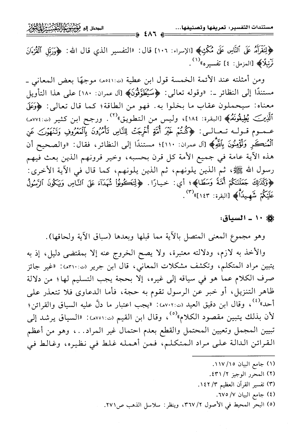 ومن أمثلته عند الأئمة الخمسة قول ابن عطية (ت: ٥٤١ هـ) موجهًا بعض المعاني -مستندًا إلى النظائر-: "وقوله تعالى: {سَيُطَوَّقوُنَ} [آل عمران: ١٨٠] على هذا التأويل معناه: سيحملون عقاب ما بخلوا به. فهو من الطاقة؛ كما قال تعالى: {وَعَلَى الَّذِيِنَ يُطِيقُونَهُ} [البقرة: ١٨٤]، وليس من التطويق" (¬٢). ورجح ابن كثير (ت: ٧٧٤ هـ) عموم قوله تعالى: {كُنْتُمْ خَيْرَ أُمَّةٍ أُخْرِجَتْ لِلنَّاسِ تَأْمُرُونَ بِالْمَعْرُوفِ وَتَنْهَوْنَ عَنِ الْمُنْكَرِ وَتُؤْمِنُونَ بِاللَّهِ} [آل عمران: ١١٠]؛ مستندًا إلى النظائر، فقال: "والصحيح أن هذه الآية عامة في جميع الأمة كل قرن بحسبه، وخير قرونهم الذين بعث فيهم رسول اللَّه -صلى اللَّه عليه وسلم-، ثم الذين يلونهم، ثم الذين يلونهم، كما قال في الآية الأخرى: {وَكَذَلِكَ جَعَلْنَاكُمْ أُمَّةً وَسَطًا}؛ أي: خيارًا. {لِتَكُونُوا شُهَدَاءَ عَلَى النَّاسِ وَيَكُونَ الرَّسُولُ عَلَيْكُمْ شَهِيدًا} [البقرة: ١٤٣] " (¬٣).