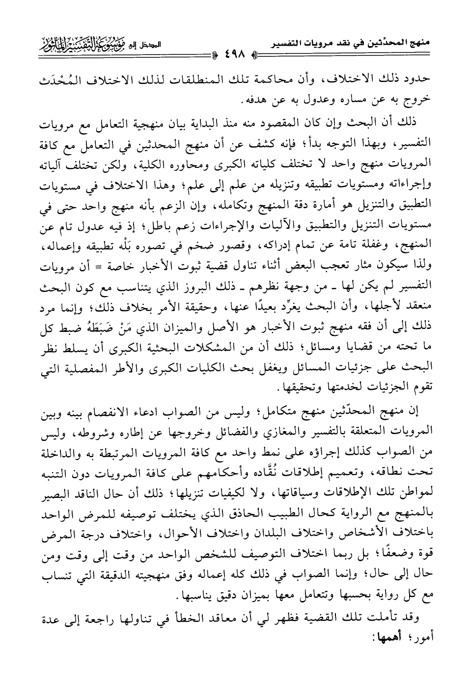 ذلك أن البحث وإن كان المقصود منه منذ البداية بيان منهجية التعامل مع مرويات التفسير، وبهذا التوجه بدأ؛ فإنه كشف عن أن منهج المحدثين في التعامل مع كافة المرويات منهج واحد لا تختلف كلياته الكبرى ومحاوره الكلية، ولكن تختلف آلياته وإجراءاته ومستويات تطبيقه وتنزيله من علم إلى علم؛ وهذا الاختلاف في مستويات التطبيق والتنزيل هو أمارة دقة المنهج وتكامله، وإن الزعم بأنه منهج واحد حتى في مستويات التنزيل والتطبيق والآليات والإجراءات زعم باطل، إذ فيه عدول تام عن المنهج، وغفلة تامة عن تمام إدراكه، وقصور ضخم في تصوره بَلْه تطبيقه وإعماله، ولذا سيكون مثار تعجب البعض أثناء تناول قضية ثبوت الأخبار خاصة = أن مرويات التفسير لم يكن لها -من وجهة نظرهم- ذلك البروز الذي يتناسب مع كون البحث منعقد لأجلها، وأن البحث يغرِّد بعيدًا عنها، وحقيقة الأمر بخلاف ذلك؛ وإنما مرد ذلك إلى أن فقه منهج ثبوت الأخبار هو الأصل والميزان الذي مَنْ ضَبَطَهُ ضبط كل ما تحته من قضايا ومسائل؛ ذلك أن من المشكلات البحثية الكبرى أن يسلط نظر البحث على جزئيات المسائل ويغفل بحث الكليات الكبرى والأطر المفصلية التي تقوم الجزئيات لخدمتها وتحقيقها.