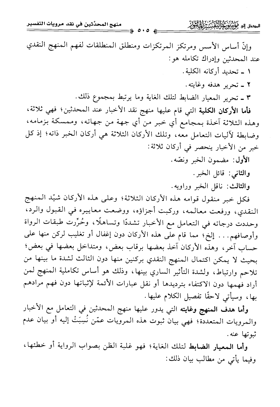 فأما الأركان الكلية التي قام عليها منهج نقد الأخبار عند المحدثين؛ فهي ثلاثة، وهذه الثلاثة آخذة بمجامع أي خبر من أي جهة من جهاته، وممسكة بزمامه، وضابطة لآليات التعامل معه، وتلك الأركان الثلاثة هي أركان الخبر ذاته، إذ كل خبر من الأخبار ينحصر في أركان ثلاثة:
