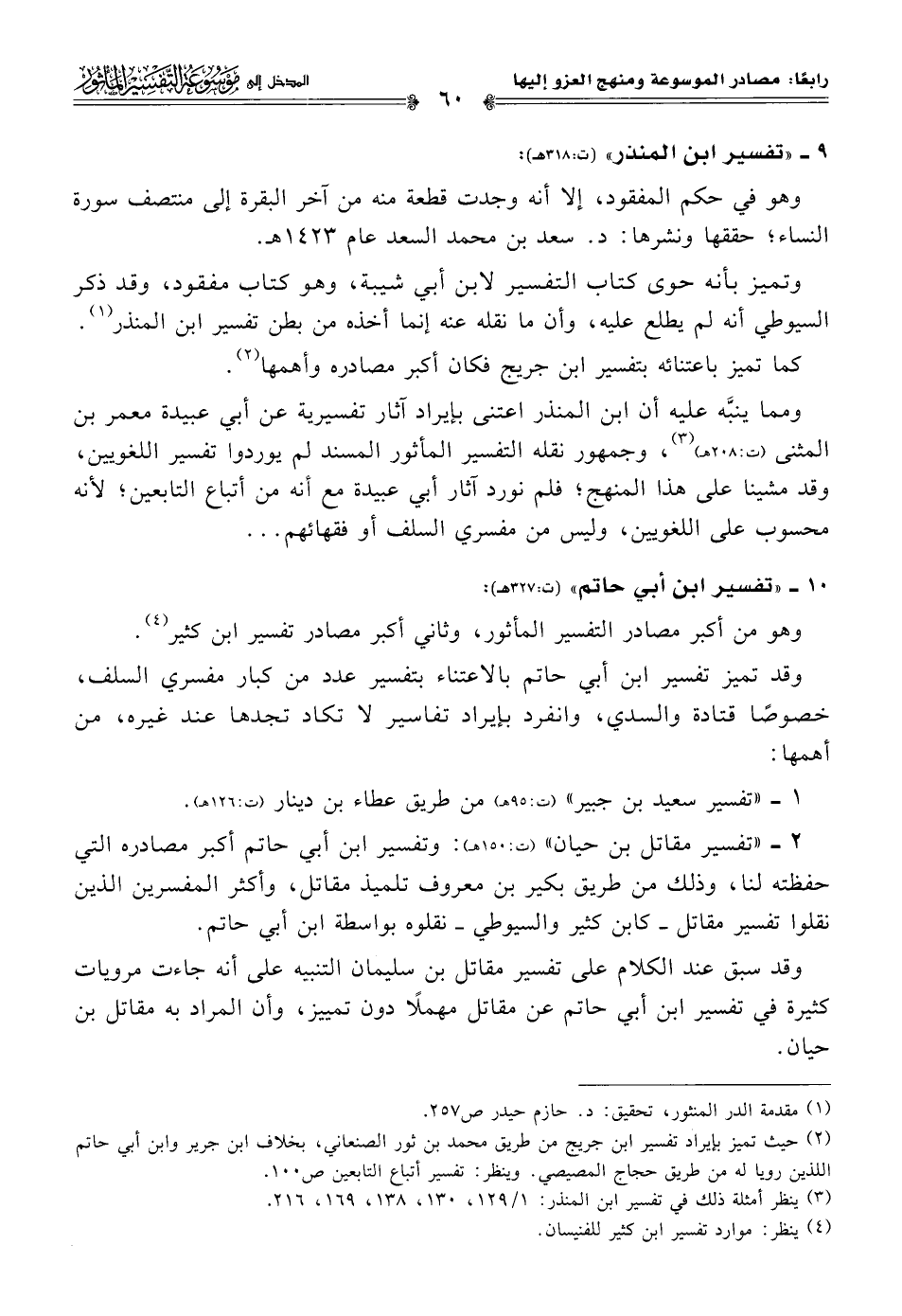 (¬٢) حيث تميز بإيراد تفسير ابن جريج من طريق محمد بن ثور الصنعاني، بخلاف ابن جرير وابن أبي حاتم اللذين رويا له من طريق حجاج المصيصي. وينظر: تفسير أتباع التابعين ص ١٠٠.