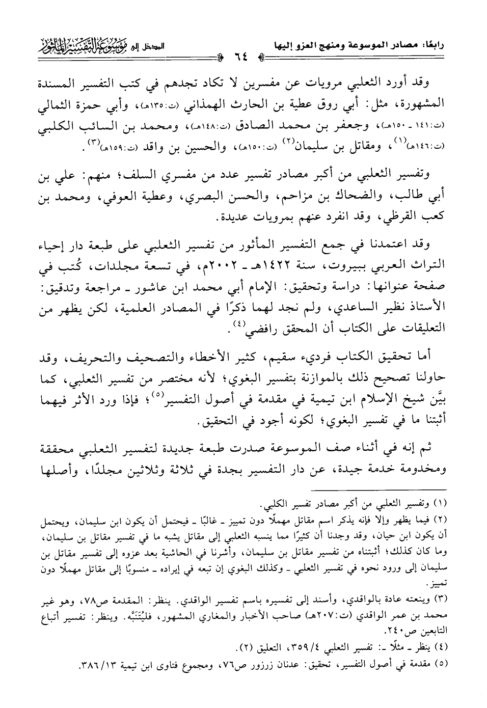 وقد اعتمدنا في جمع التفسير المأثور من تفسير الثعلبي على طبعة دار إحياء التراث العربي ببيروت، سنة ١٤٢٢ هـ - ٢٠٠٢ م، في تسعة مجلدات، كُتب في صفحة عنوانها: دراسة وتحقيق: الإمام أبي محمد ابن عاشور - مراجعة وتدقيق: الأستاذ نظير الساعدي، ولم نجد لهما ذكرًا في المصادر العلمية، لكن يظهر من التعليقات على الكتاب أن المحقق رافضي (¬٤).