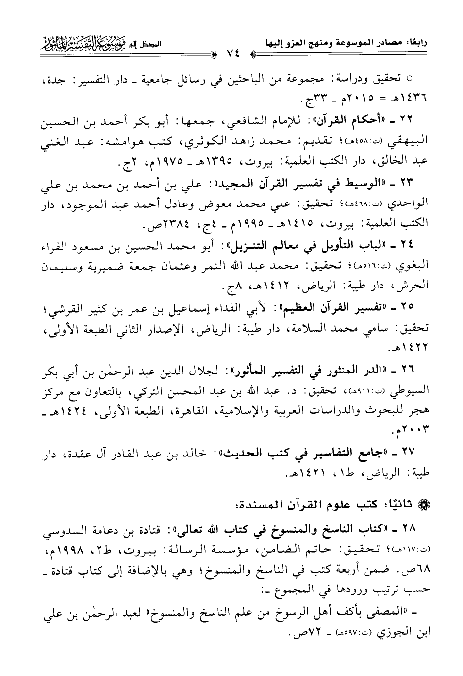 ٢٦ - "الدر المنثور في التفسير المأثور": لجلال الدين عبد الرحمن بن أبي بكر السيوطي (ت: ٩١١ هـ)، تحقيق: د. عبد اللَّه بن عبد المحسن التركي، بالتعاون مع مركز هجر للبحوث والدراسات العربية والإسلامية، القاهرة، الطبعة الأولى، ١٤٢٤ هـ - ٢٠٠٣ م.