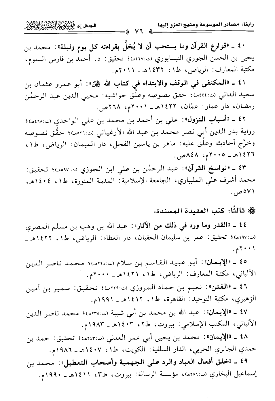 ٤٠ - "قوارع القرآن وما يستحب أن لا يُخلَّ بقراءته كل يوم وليلة": محمد بن يحيى بن الحسن الجوري النيسابوري (ت: ٤٢٧ هـ)؛ تحقيق: د. أحمد بن فارس السلوم، مكتبة المعارف: الرياض، ط ١، ١٤٣٢ هـ - ٢٠١١ م.