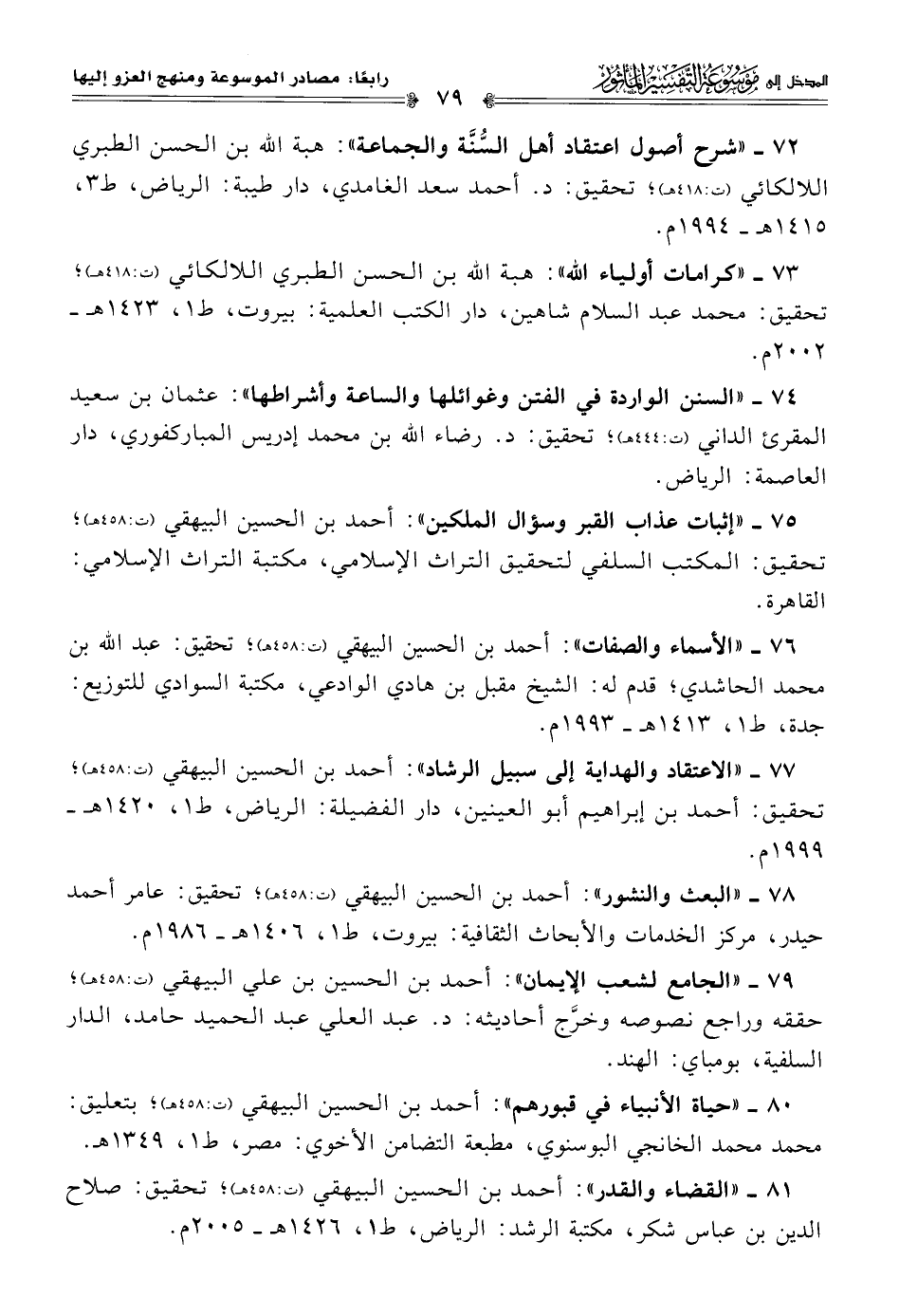 ٧٨ - "البعث والنشور": أحمد بن الحسين البيهقي (ت: ٤٥٨ هـ)؛ تحقيق: عامر أحمد حيدر، مركز الخدمات والأبحاث الثقافية: بيروت، ط ١، ١٤٠٦ هـ - ١٩٨٦ م.