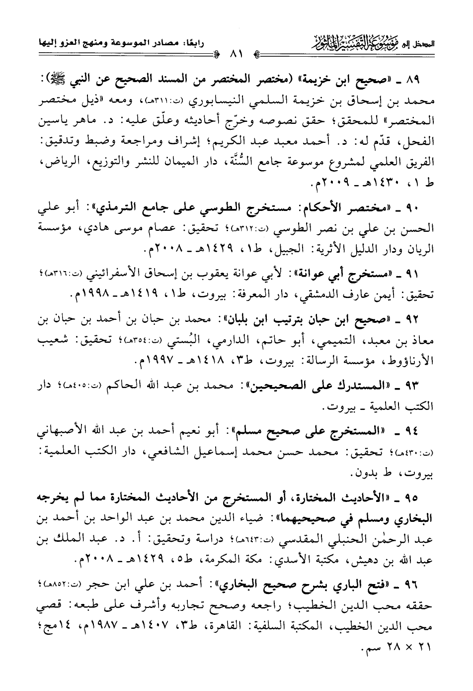 ٩٢ - "صحيح ابن حبان بترتيب ابن بلبان": محمد بن حبان بن أحمد بن حبان بن معاذ بن معبد، التميمي، أبو حاتم، الدارمي، البُستي (ت: ٣٥٤ هـ)؛ تحقيق: شعيب الأرناؤوط، مؤسسة الرسالة: بيروت، ط ٣، ١٤١٨ هـ - ١٩٩٧ م.