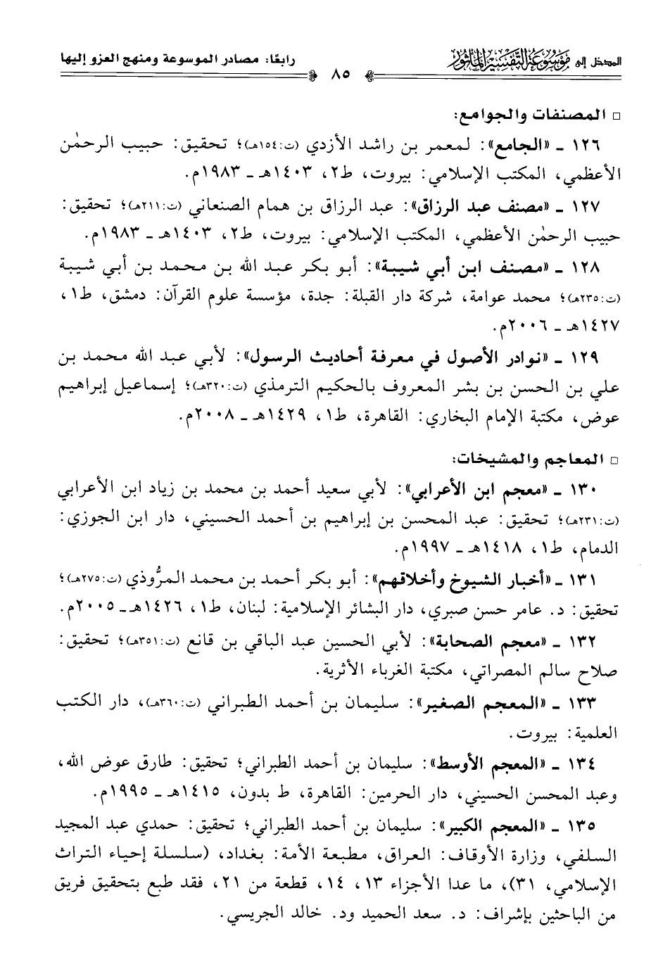 ١٣٥ - "المعجم الكبير": سليمان بن أحمد الطبراني؛ تحقيق: حمدي عبد المجيد السلفي، وزارة الأوقاف: العراق، مطبعة الأمة: بغداد، (سلسلة إحياء التراث الإسلامي، ٣١)، ما عدا الأجزاء ١٣، ١٤، قطعة من ٢١، فقد طبع بتحقيق فريق من الباحثين بإشراف: د. سعد الحميد ود. خالد الجريسي.