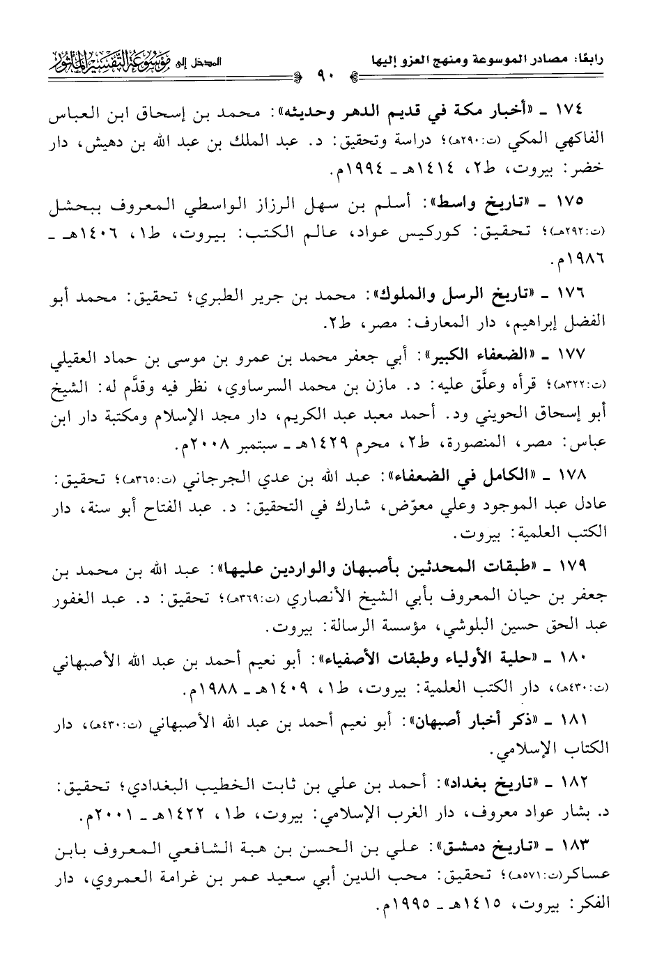 ١٧٥ - "تاريخ واسط": أسلم بن سهل الرزاز الواسطي المعروف ببحشل (ت: ٢٩٢ هـ)؛ تحقيق: كوركيس عواد، عالم الكتب: بيروت، ط ١، ١٤٠٦ هـ - ١٩٨٦ م.