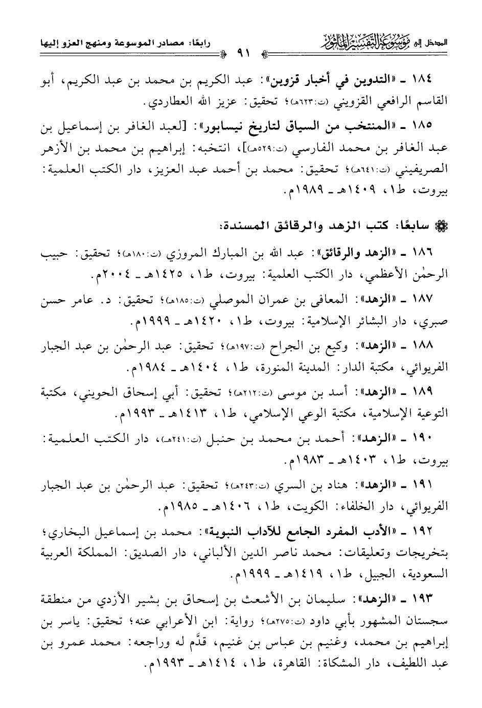 ١٩١ - "الزهد": هناد بن السري (ت: ٢٤٣ هـ)، تحقيق: عبد الرحمن بن عبد الجبار الفريوائي، دار الخلفاء: الكويت، ط ١، ١٤٠٦ هـ - ١٩٨٥ م.