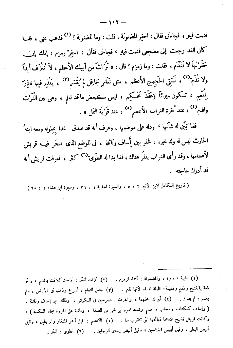 فلما بين له شأنها، ودله على موضعها، وعرف أنه قد صدق. غدا بمعوله ومعه ابنه الحارث ليس له ولد غيره، فحفر بين أساف ونائلة، في الموضع الذي تنحر فيه قريش لأصنامها، وقد رأى الغراب ينقر هناك؛ فلما بدا له الطوي6 كبر، فعرفت قريش أنه قد أدرك حاجته.