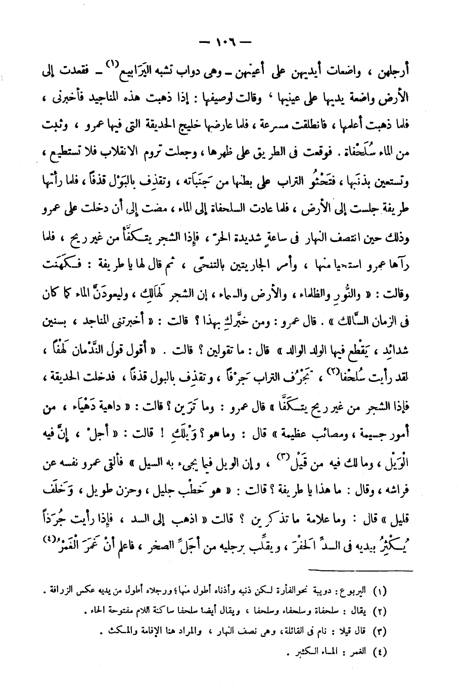 أرجلهن، واضعات أيديهن على أعينهن -وهي دواب تشبه اليرابيع1- فقعدت إلى الأرض واضعة يديها على عينيها، وقالت لوصيفها: إذا ذهبت هذه المناجيد فأخبرني؛ فلما ذهبت أعلمها، فانطلقت مسرعة؛ فلما عارضها خليج الحديقة التي فيها عمرو، وثبت من الماء سلحفاة. فوقعت في الطريق على ظهرها، وجعلت تروم الانقلاب فلا تستطيع، وتستعين بذنبها، فتحثو التراب على بطنها من جنباته، وتقذف بالبول قذفًا، فلما رأتها طريفة جلست إلى الأرض، فلما عادت السلحفاة إلى الماء، مضت إلى أن دخلت على عمرو وذلك حين انتصف النهار في ساعة شديدة الحر، فإذا الشجر يتكفأ من غير ريح، فلما رآها عمرو استحيا منها، وأمر الجاريتين بالتنحي، ثم قال لها يا طريفة: فكهنت وقالت: "والنور والظلماء، والأرض والسماء، إن الشجر لهالك، وليعودن الماء كما كان في الزمان السالك". قال عمرو: ومن خبرك بهذا؟ قالت: "أخبرتني المناجد، بسنين شدائد، يقطع فيها الولد الوالد" قال: ما تقولين.؟ قالت: "أقول قول الندمان لهفًا، لقد رأيت سلحفًا2، تجرف التراب جرفًا، وتقذف بالبول قذفًا، فدخلت الحديقة، فإذا الشجر من غير ريح يتكفَّا" قال عمرو: وماترين؟ قالت: "داهية دهياء، من أمور جسيمة، ومصائب عظيمة" قال: وما هو؟ ويلك! قالت: "أجل، إن فيه الويل، وما لك فيه من قيل3، وإن الويل فيما يجيء به السيل" فألقى عمرو نفسه عن فراشه، وقال: ما هذا يا طريفة؟ قالت: "هو خطب جليل، وحزن طويل، وخلف قليل" قال: وما علامة ما تذكرين؟ قالت "اذهب إلى السد؛ فإذا رأيت جردًا يكثر بيديه في السد الحفر، ويقلب برجليه من أجل الصخر، فاعلم أن غمر الغمر4