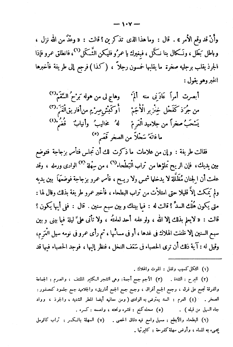 فقالت طريفة: وإن من علامات ما ذكرت لك أن تجلس فتأمر بزجاجة فتوضع بين يديك؛ فإن الريح تملؤها من تراب البطحاء6، من سهلة7 الوادي ورمله، وقد علمت أن الجنان مظللة لا يدخلها شمس ولا ريح، فأمر عمرو بزجاجة فوضعها بين يديه ولم يمكث إلا قليلًا حتى امتلأت من تراب البطحاء، فأخبر عمرو طريفة بذلك وقال لها: متى يكون هلك السد؟ قالت له: فيما بينك وبين سبع سنين. قال: ففي أيها يكون؟ قالت: "لا يعلم بذلك إلا الله، ولو علمه أحد لعلمته، ولا تأتي علي ليلة فيما بيني وبين سبع السنين إلا ظننت الهلاك في غدها، أو في مسائها، ثم رأى عمرو في نومه سيل العرم، وقيل له: آية ذلك أن ترى الحصباء في سعف النخل؛ فنظر إليها، فوجد الحصباء فيها قد