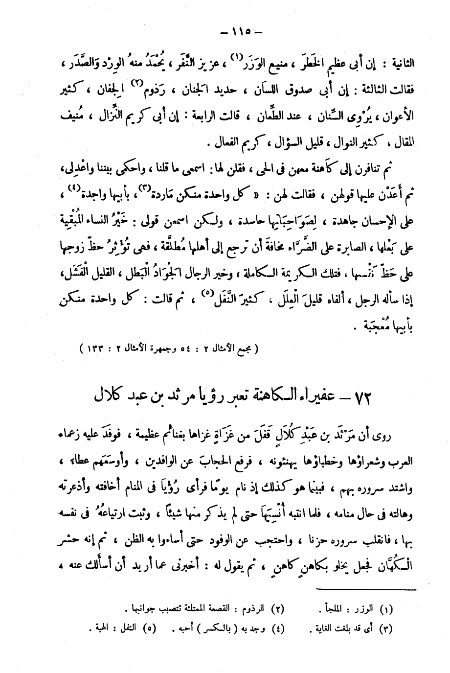 ثم تنافرت إلى كاهنة معهن في الحي؛ فقلن لها: اسمعي ما قلنا، واحكمي بيننا واعدلي، ثم أعدن عليها قولهن؛ فقالت لهن: "كل واحدة منكن ماردة3، بأبيها واجدة4، على الإحسان جاهدة، لصواحباتها حاسدة؛ ولكن اسمعن قولي: خير النساء المبقية على بعلها، الصابرة على الضراء مخافة أن ترجع إل أهلها مطلقة؛ فهي تؤثر حظ زوجها على حظ نفسها؛ فتلك الكريمة الكاملة، وخير الرجال الجواد البطل، القليل الفشل، إذا سأله الرجل، ألفاه قليل العلل، كثير النفل5، ثم قالت: كل واحدة منكن بأبيها معجبة.