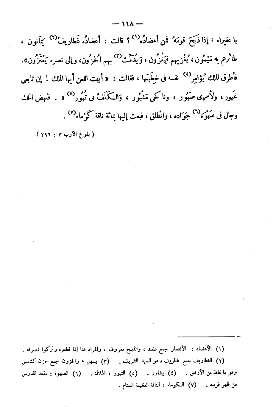 يا غفيراء، إذا ذبح قومه فمن أعضاده1؟ قالت: أعضاده غطاريف2 يمانون، طائرهم به ميمون، يغزيهم فيغزون، ويدمث3 بهم الحزون وإلى نصره يعتزون". فأطرق الملك يؤامر4 نفسه في خطبتها، فقالت: "أبيت اللعن أيها الملك! إن تابعي غيور، ولأمري صبور، وناكحي مثبور، والكلف بي ثبور5". فنهض الملك وجال في صهوة6 جواده، وانطلق، فبعث إليها بمائة ناقة كوماء7.