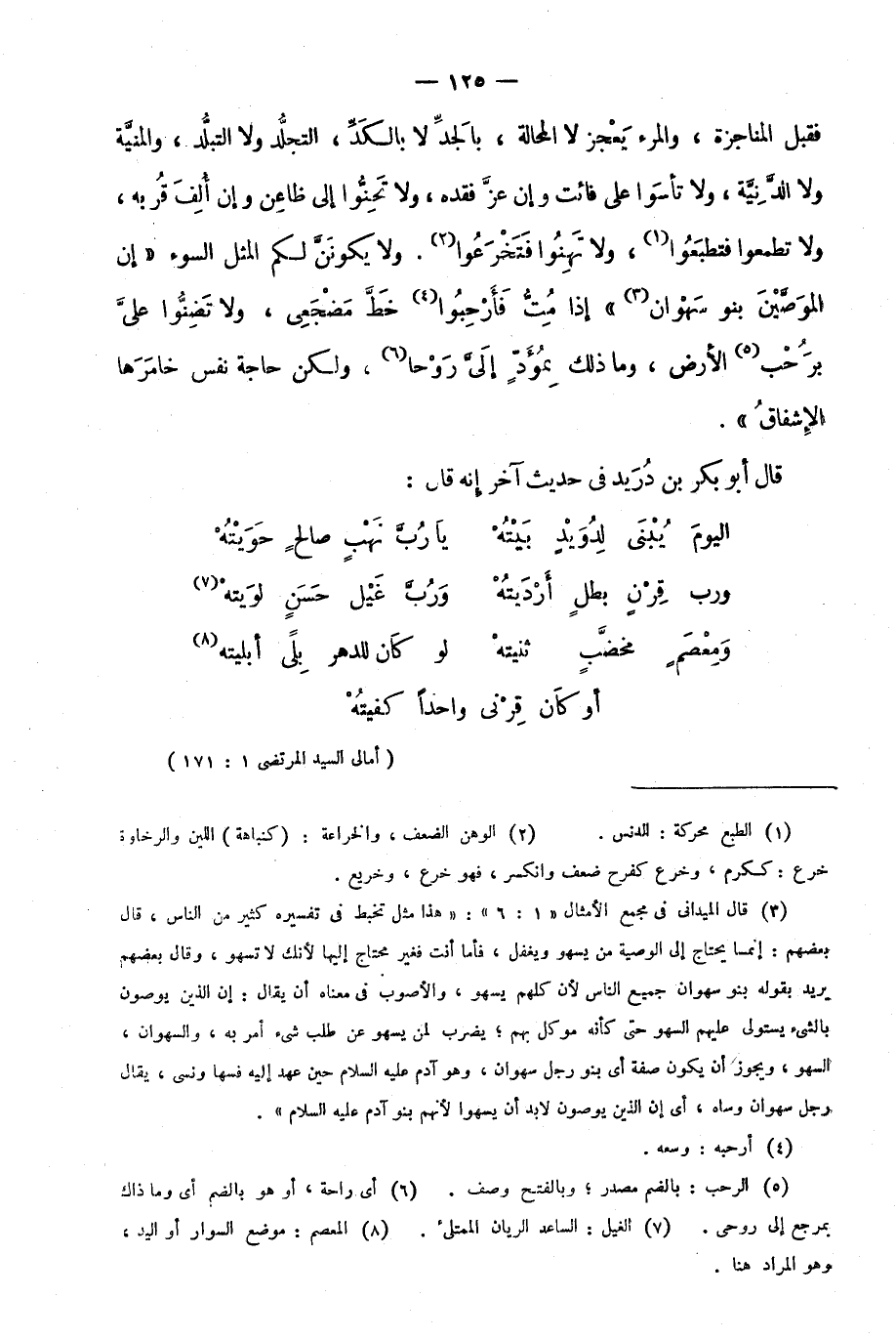 فقبل المناجزة، والمرء يعجز لا المحالة، بالجد لا بالكد، والتجلد ولا التبلد، والمنية ولا الدنية، ولا تأسوا على فائت وإن عز فقده، ولا تحنوا إلى ظاعن وإن ألف قربه، ولا تطمعوا فتطبعوا1، ولا تهنوا فتخرعوا2. ولا يكونن لكم المثل السوء "إن الموصين بنو سهوان3" إذا مت فأرحبوا4 خط مضجعي، ولا تضنوا على برحب5 الأرض، وما ذلك بمؤد إلى روحا6، ولكن حاجة نفس خامرها الإشفاق".