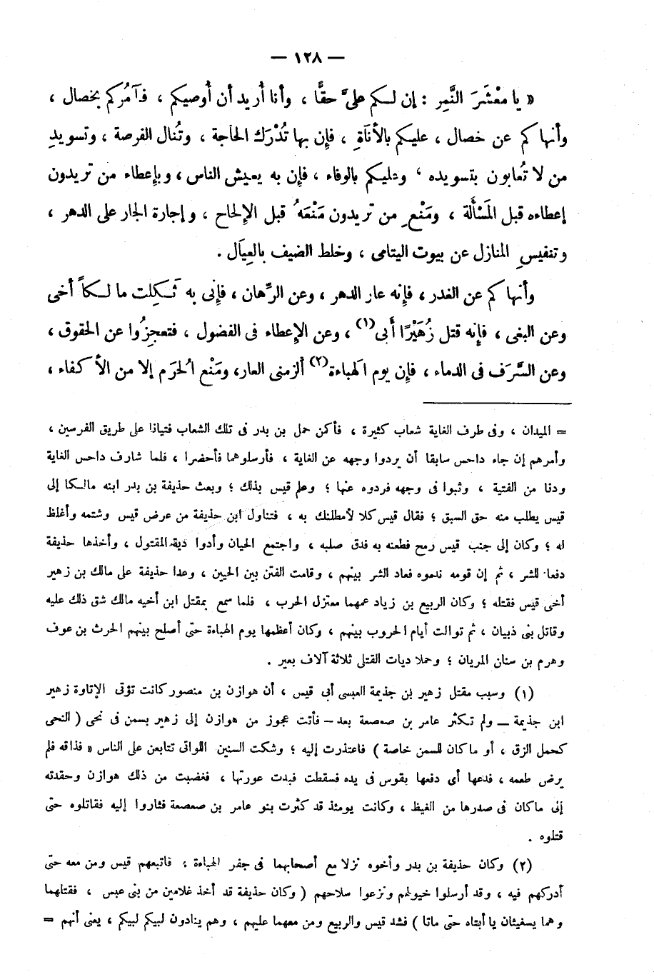 وأنهاكم عن الغدر؛ فإنه عار الدهر، وعن الرهان، فإني به ثكلت مالكًا أخي وعن الغي، فإنه قتل زهيرًا أبي1، وعن الإعطاء في الفضول، فتعجزا عن الحقوق، وعن السرف في الدماء، فإن يوم الهباءة3 ألزمني العار، ومنع الحرم إلا من الأكفاء،