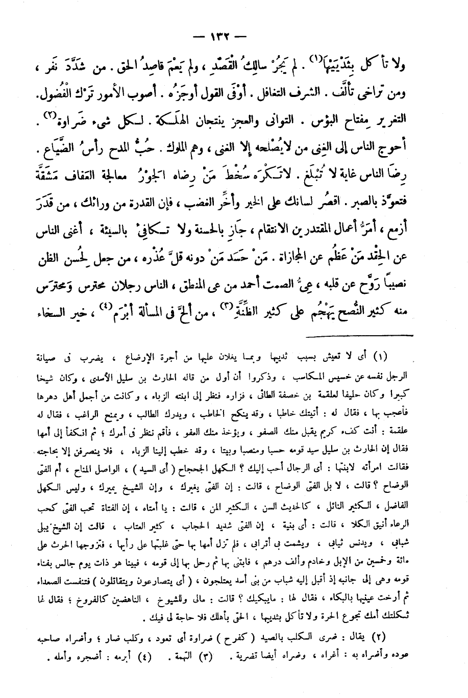 ولا تأكل بثدييها1. لم يجر سالك القصد، ولم يعم قاصد الحق، من شدد نفر، ومن تراخى تألف. الشرف التغافل. أوفى القول أو جزه. أصوب الأمور ترك الفضول التغرير مفتاح البؤس. التواني والعجز ينتجان الهلكة. لكل شيء ضراوة2. أحوج الناس إلى الغنى من لا يصلحه إلا الغنى، وهم الملوك. حب المدح رأس الضياع. رضا الناس غاية لا تبلغ. لا تركه سخط من رضاه الجور معالجة العفاف مشقة فتعوذ بالصبر. اقصر لسانك على الخير وأآخر الغضب؛ فإن القدرة ممن ورائك، من قدر أزمع، أمر أعمال المقتدرين الانتقام، جاز بالحسنة ولا تكافئ بالسيئة، أغنى الناس عن الحقد من عظم عن المجازاة. من حسد من دونه قل عذره، من جعل لحسن الظن نصيبًا روح عن قلبه، عي الصمت أحمد من عي المنطق، الناس رجلان محترس ومحترس منه كثير النصح يهجم على كثير الظنة3، ومن ألح في المسألة أبرم4، خير السخاء