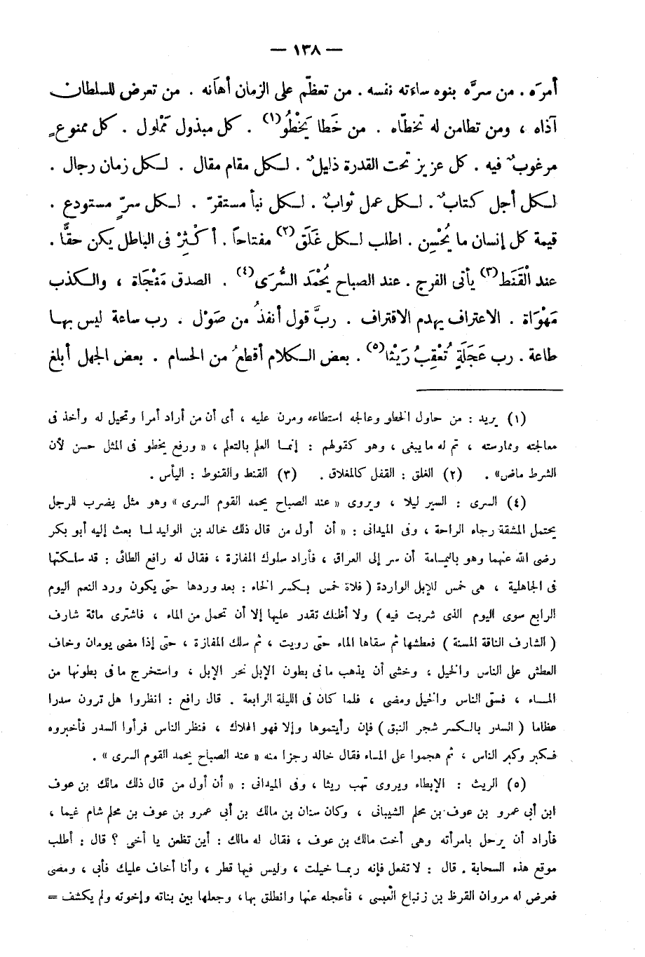 أمره. من سره بنوه ساءته نفسه. من تعظم على الزمان أهانه. من تعرض للسلطان آذاه، ومن تطامن له تخطاه. من خطأ يخطو1. كل مبذول مملول، كل ممنوع مرغوب فيه. كل عزيز تحت القدرة ذليل. لكل مقام مقال. لكل زمان رجال. لكل أجل كتاب. لك عمل ثواب. لكل نبأ مستقر. لكل سر مستودع. قيمة كل إنسان ما يحسن. اطلب لكل غلق2 مفتاحًا. أكثر في الباطل يكن حقًّا. عند القنط3 يأتي الفرج. عند الصباح يحمد السرى4. الصدق منجاة، والكذب مهواة. الاعتراف يهدم الاقتراف. رب قول أنفذ من صول. رب ساعة ليس بها طاعة. رب عجلة تعقب ريثًا5. بعض الكلام أقطع من الحسام، بعض الجهل أبلغ