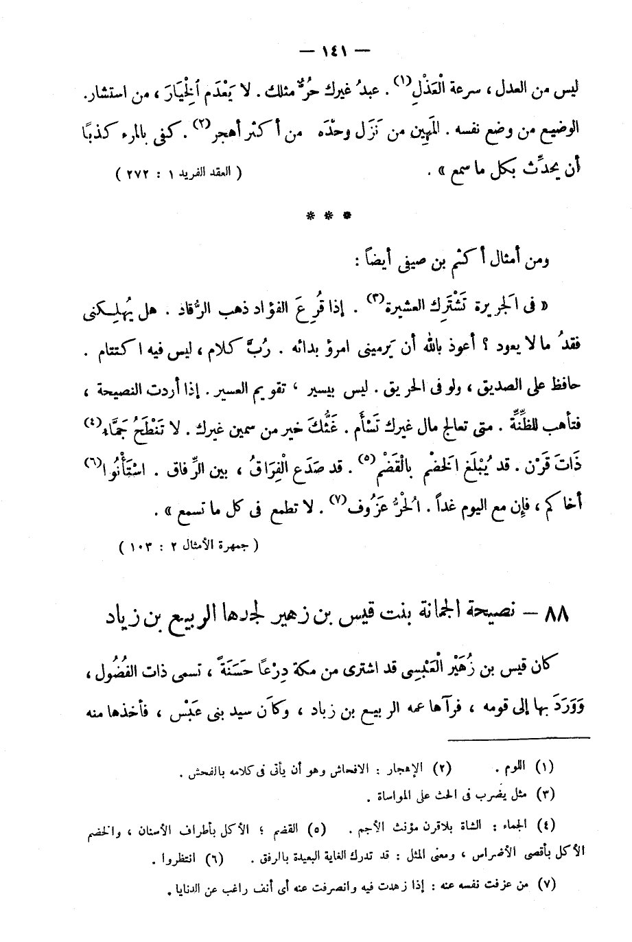 ليس من العدل، سرعة العذل1. عبد غيرك حر مثلك. لا يعدم الخيار، من استشار. الوضيع من وضع نفسه. المهين من نزل وحده من أكثر أهجر2. كفى بالمرء كذبًا أن يحدث بكل ما سمع".