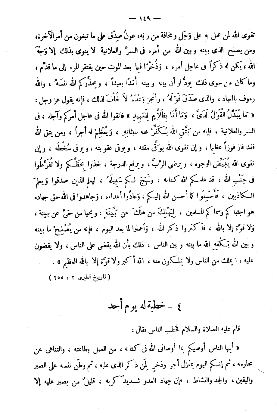 "أيها الناس أوصيكم بما أوصاني الله في كتابه، من العمل بطاعته، والتناهي عن محارمه، ثم إنكم اليوم بمنزل أجر وذخر لمن ذكر الذي عليه، ثم وطن نفسه على الصبر واليقين، والجد والنشاط؛ فإن جهاد العدو شديد كربه، قليل من يصبر عليه إلا