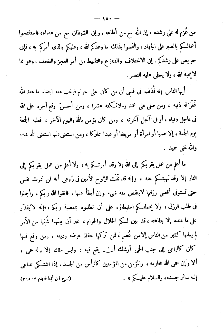 ما أعلم من عمل يقربكم إلى الله إلا وقد أمرتكم به، ولا أعلم من عمل يقربكم إلى النار إلا وقد نهيتكم عنه، وإنه قد نفث الروح الأمين في روعي أنه لن تموت نفس حتى تستوفي أقصى رزقها لا ينقص منه شيء وإن أبطأ عنها؛ فاتقوا الله ربكم، وأجملوا في طلب الرزق، ولا يحملنكم استبطاؤه على أن تطلبوه بمعصية ربكم؛ فإنه لا يقدر على ما عنده إلى بطاعته، قد بين لكم الحلال والحرام؛ غير أن بينهما شبهًا من الأمر لم يعلمها كثير من الناس إلا من عصم؛ فمن تركها حفظ عرضه ودينه، ومن وقع فيها كان كالراعي إلى جنب الحمى أوشك أن يقع فيه، وليس ملك إلا وله حمى؛ ألا وإن حمى الله محارمه، والمؤمن من المؤمنين كالرأس من الجسد، إذا اشتكى تداعى إليه سائر جسده، والسلام عليكم".