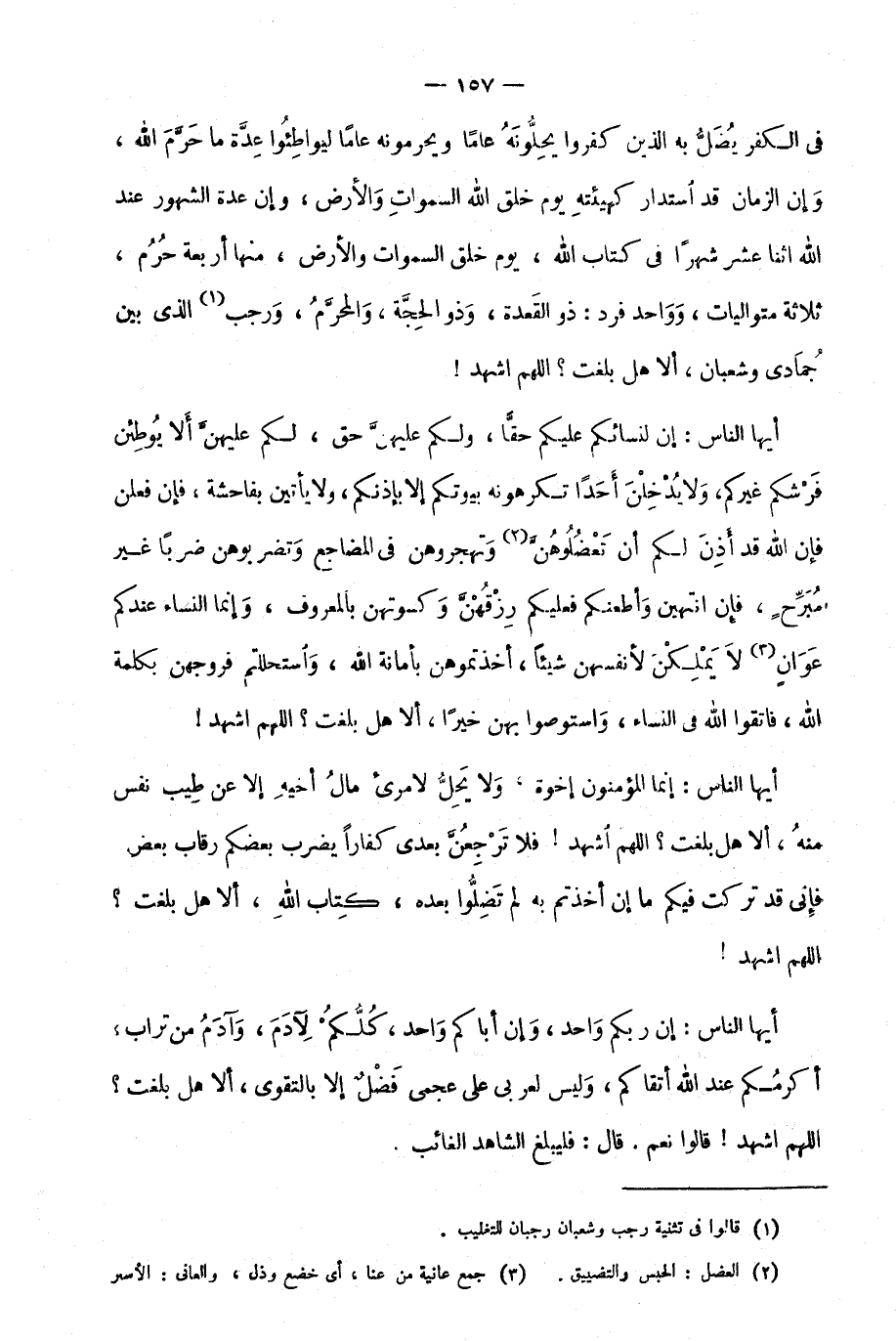 أيها الناس: إن لنسائكم عليكم حقًّا، ولكم عليهن حق، لكم عليهن ألا يوطئن فرشكم غيركم ولا يدخلن أحدًا تكرهونه بيوتكم إلا بإذنكم، ولا يأتين بفاحشة؛ فإن فعلن فإن الله قد أذن لكم أن تعضلوهن2 وتهجروهن في المضاجع وتضربوهن ضربًا غير مبرح؛ فإن انتهين وأطعنكم فعليكم رزقهن وكسوتهن بالعروف، وإنما النساء عندكم عوان3 لا يملكن لأنفسهن شيئًا، أخذتموهن بأمانة الله، واستحللتم فروجهن بكلمة الله، فاتقوا الله في النساء، واستوصوا بهن خيرًا، ألا هل بلغت؟ اللهم اشهد!