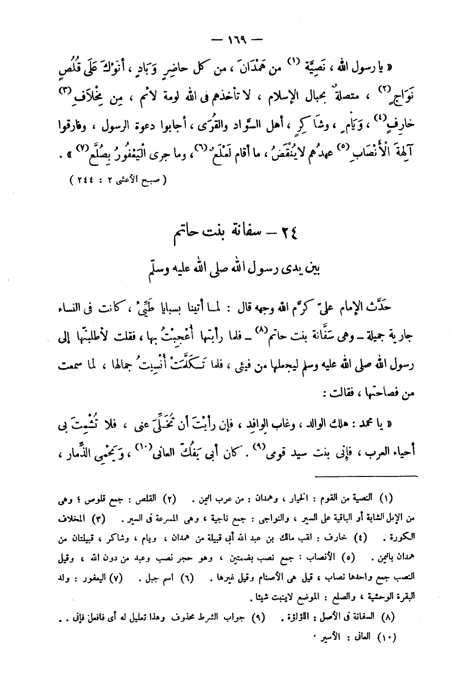 حدث الإمام علي كرم الله وجهه قال: لما أتينا بسبايا طيئ، كانت في النساء جارية جميلة -وهي سفانة بنت حاتم1؛ فلما رأيتها أعجبت بها؛ فقلت لأطلبنها إلى رسول الله صلى الله عليه وسلم ليجعلها من فيئي؛ فلما تكملت أنسيت جمالها، لما سمعت من فصاحتها، فقالت: