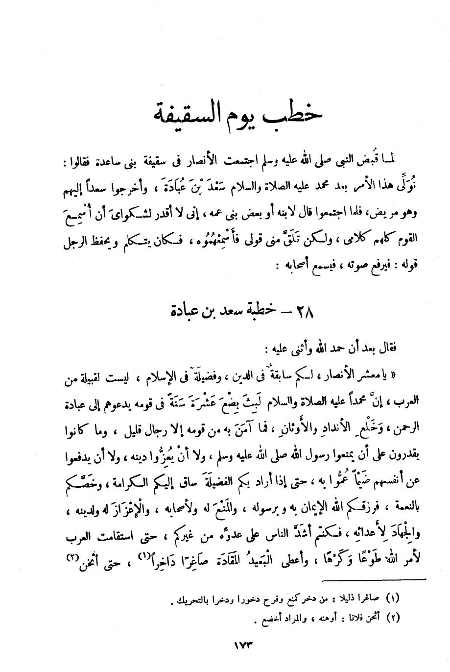 "يا معشر الأنصار، لكم سابقة في الدين، وفضيلة في الإسلام، ليست لقبيلة من العرب، إن محمدًا عليه الصلاة والسلام لبث عشرة سنة في قومه يدعوهم إلى عبادة الرحمن، وخلع الأنداد والأوثان؛ فما آمن به من قومه إلا رجل قليل، وما كانوا يقدرون على أن يمنعوا رسول الله صلى الله عليه وسلم، ولا أن يعزوا دينه، ولا أن يدفعوا عن أنفسهم ضيمًا عموا به، حتى إذا أراد بكم الفضيلة ساق إليكم الكرامة، وخصكم بالنعمة؛ فرزقكم الله الإيمان به وبرسوله، والمنع له ولأصحابه، والإعزاز له ولدينه، والجهاد لأعدائه؛ فكنتم أشد الناس على عدوه من غيركم، حتى استقامت العرب لأمر الله طوعًا وكرهًا، وأعطى البعيد المقادة صاغرًا داخرًا1، حتى أثخن2