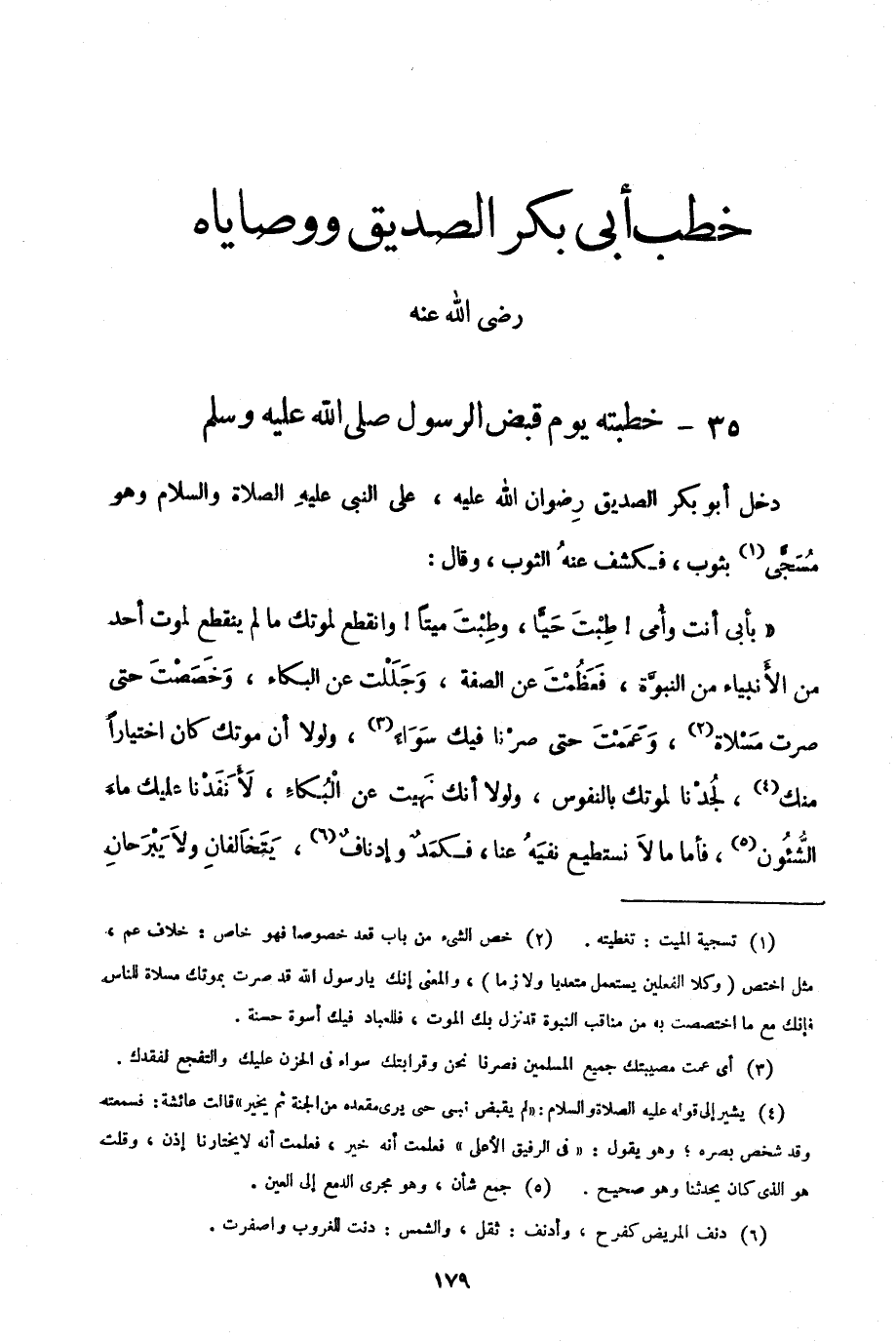 "بأبي أنت وأمي! طبت حيًّا، وطبت ميتًا! وانقطع لموتك ما لم ينقطع لموت أحد من الأنبياء من النبوة، فعظمت عن الصفة، وجللت عن البكاء، وخصصت حتى صرت مسلاة2، وعممت حتى صرنا فيك سواءً3، ولولا أن موتك كان اختيارًا منك4، لجدنا لموتك بالنفوس، ولولا أنك نهيت عن البكاء؛ لأنفدنا عليك ماء الشئون5؛ فأما ما لا نستطيع نفيه عنا، فكمد وإدناف6، يتخالفان ولا يبرحان