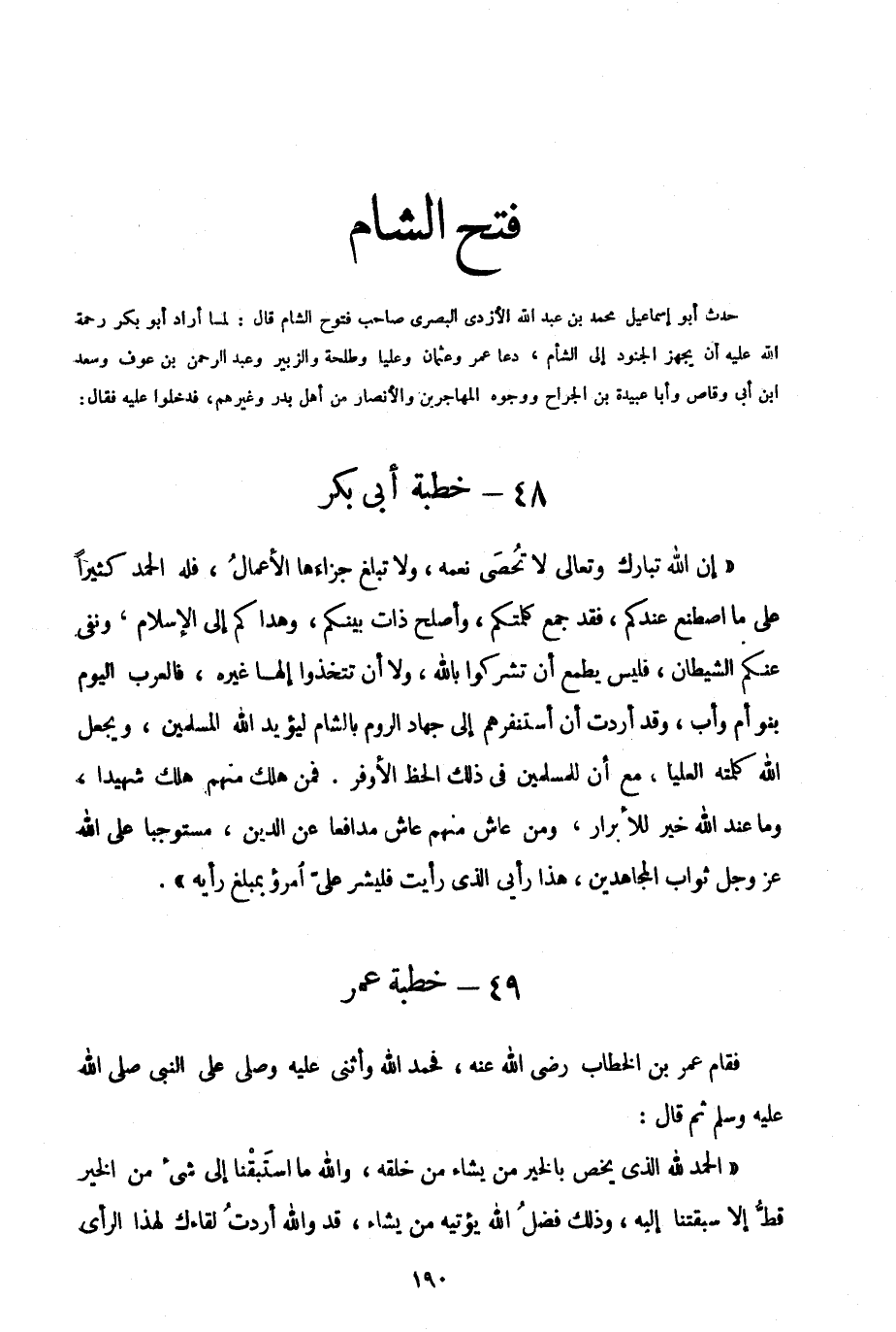 حدث أبو إسماعيل محمد بن عبد الأزدي البصري صاحب فتوح الشام قال: لما أراد أبو بكر رحمة الله عليه أن يجهز الجنود إلى الشأم؛ دعا عمر وعثمان وعليًّا وطلحة والزبير وعبد الرحمن بن عوف وسعد بن أبي وقاص وأبا عبيدة بن الجراح ووجوه المهاجرين والأنصار من أهل بدر وغيرهم، فدخلوا عليه فقال: