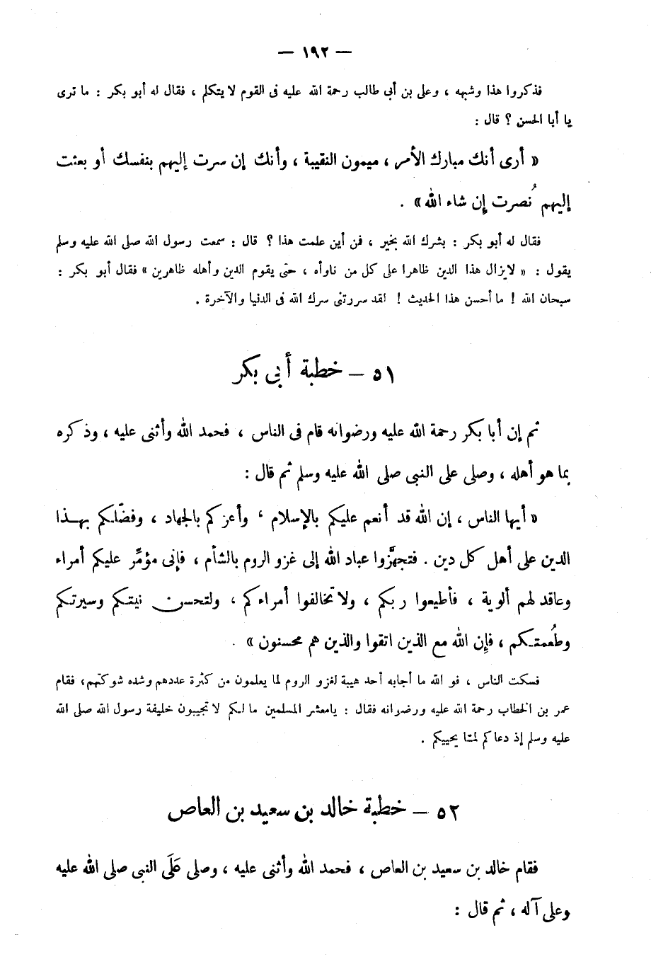 فقام خالد بن سعيد بن العاص، فحمد الله وأثنى عليه، وصلى على النبي صلى الله عليه وسلم وعلى آله، ثم قال: