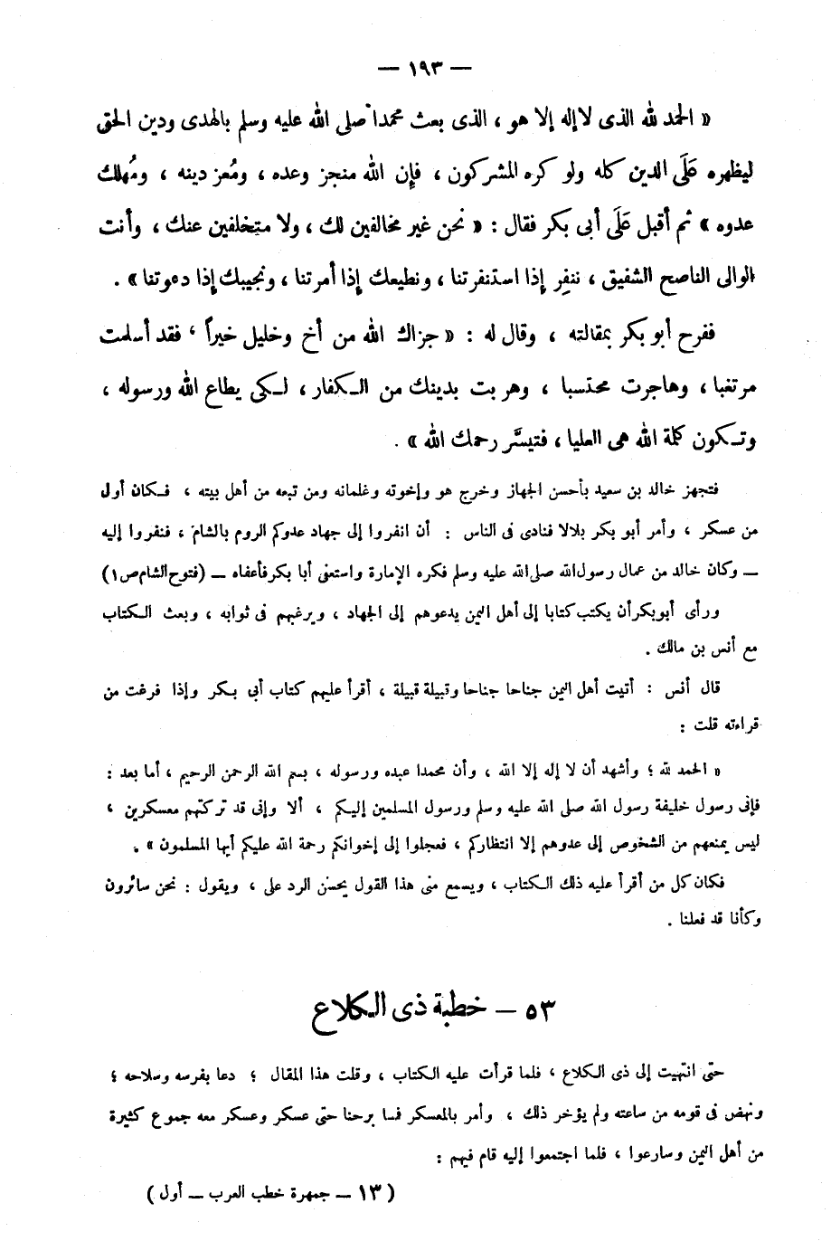 "الحمد لله، وأشهد أن لا إله إلا الله، وأن محمدًا عبده ورسوله، بسم الله الرحمن الرحيم، أما بعد: فإني رسول خليفة رسول الله صلى الله عليه وسلم ورسول المسلمين إليكم، ألا وإني قد تركتهم معسكرين، ليس يمنعهم من الشخوص إلى عدوهم إلا انتظاركم، فعجلوا إلى إخوانكم رحمة الله عليكم أيها المسلمون".