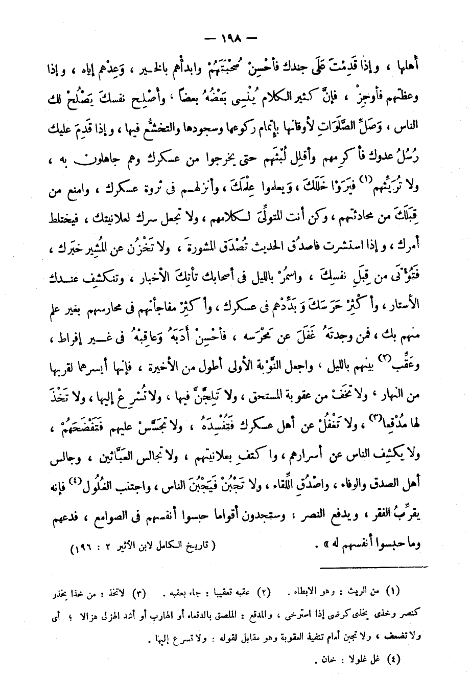 أهلها، وإذا قدمت على جندك فأحسن صحبتهم وابدأهم بالخير، وعدهم إياه، وإذا وعظتهم فأوجز؛ فإن كثير الكلام ينسي بعضه بعضًا، وأصلح نفسك يصلح لك الناس، وصل الصلوات لأوقاتها بإتمام ركوعها وسجودها والتخشع فيها، وإ ذا قدم عليك رسل عدوك فأكرمهم وأقلل لبثهم حتى يخرجوا من عسكرك وهم جاهلون به، ولا تريثهم1 فيروا خللك، ويعلموا علمك، وأنزلهم في ثروة عسكرك، وامنع من قبلك من محادثتهم، وكن أنت المتولي لكلامهم، ولا تجعل سرك لعلانيتك؛ فيختلط أمرك، وإذا استشرت فاصدق الحديث تصدق المشورة، ولا تخزن عن المشير خبرك، فتؤتى من قبل نفسك، واسمر بالليل في أصحابك تأتك الأخبار، وتنكشف عندك الأستار، وأكثر حرسك وبددهم في عسكرك، وأكثر مفاجأتهم في محارسهم بغير علم منهم بك، فمن وجدته غفل عن محرسه؛ فأحسن أدبه وعاقبه في غير إفراط، وعقب2 بينهم بالليل، واجعل النوبة الأولى أطول من الأخيرة؛ فإنها أيسرهما لقربها من النهار، ولا تخف من عقوبة المستحق، ولا تلجن فيها، ولا تسرع إليها، ولا تخذ لها مدقعًا3، ولا تغفل عن أهل عسكرك فتفسده، ولا تجسس عليهم فتفضحهم، ولا يكشف الناس عن أسرارهم، واكتف بعلانيتهم، ولا تجالس العباثين وجالس أهل الصدق والوفاء، واصدق اللقاء، ولا تجبن فيجبن الناس، واجتنب الغلول4؛ فإنه يقرب الفقر، ويدفع النصر، وستجدون أقوامًا حبسوا أنفسهم في الصوامع، فدعهم وما حبسوا أنفسهم له".