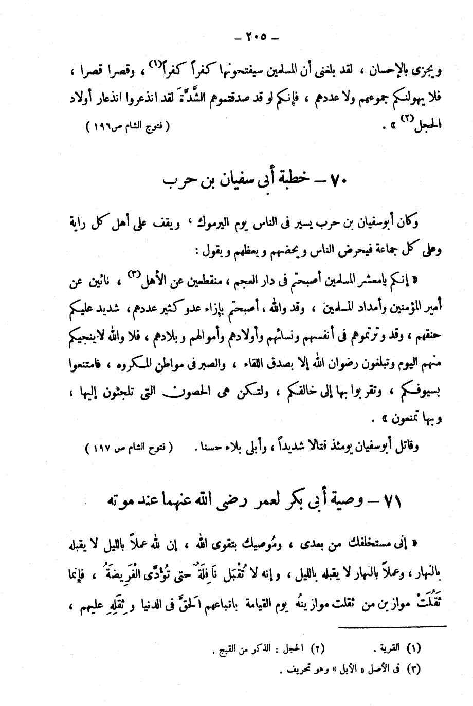 "إنكم يا معشر المسلمين أصبحتم في دار العجم، منقطعين عن الأهل1، نائين عن أمير المؤمنين وأمداد المسلمين، وقد والله، أصبحتم بإزاء عدو كثير عددهم، شديد عليكم حنقهم، وقد وترتموهم في أنفسهم ونسائهم وأولادهم وأموالهم وبلادهم، فلا والله لا ينجيكم منهم اليوم وتبلغون رضوان الله إلا بصدق اللقاء، والصبر في مواطن المكروه، فامتنعوا بسيوفكم، وتقربوا بها إلى خالقكم، ولتكن هي الحصون التي تلجئون إليها، وبها تمنعون".