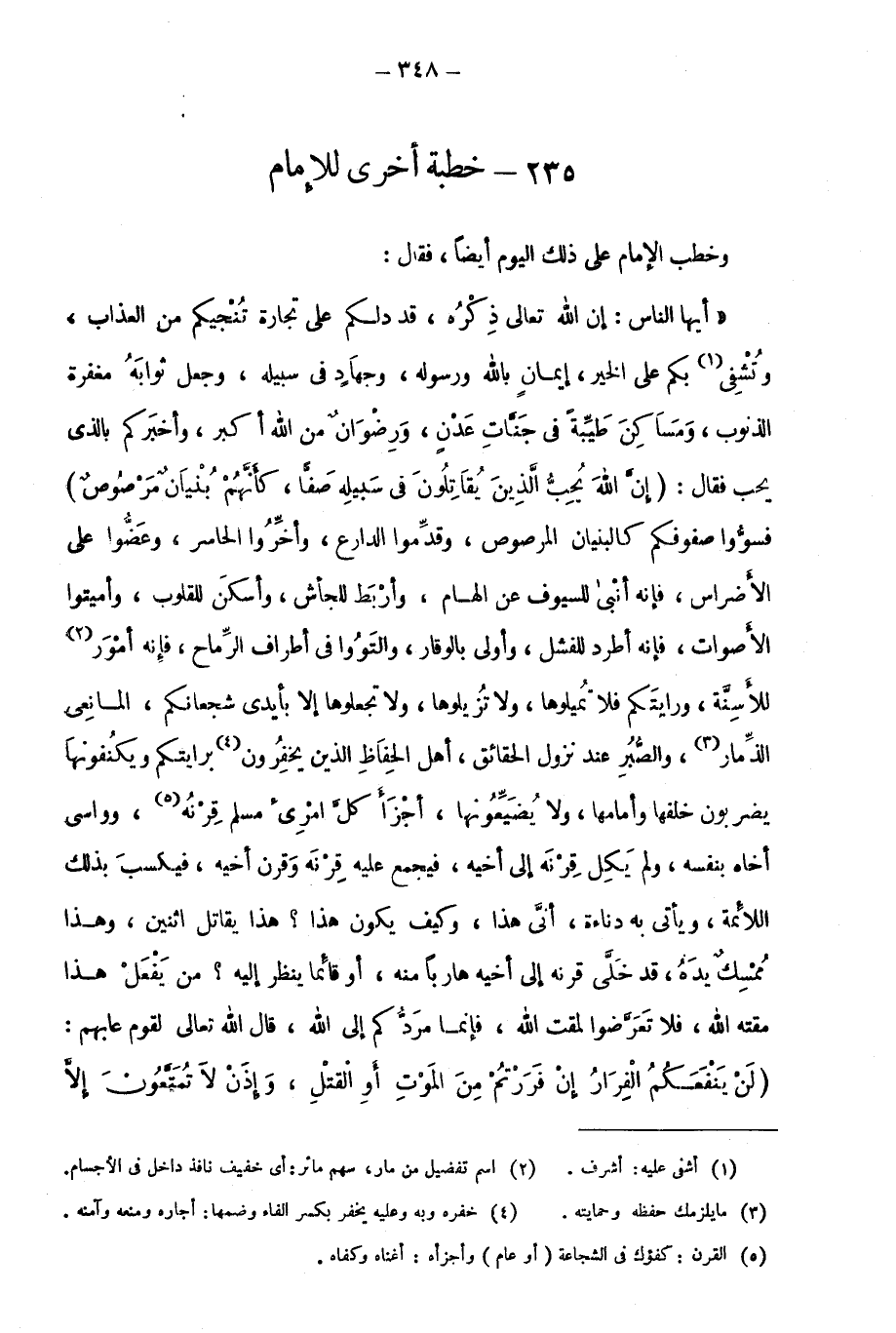 "أيها الناس: إن الله تعالى ذكره، قد دلكم على تجارة تنجيكم من العذاب، وتشفي1 بكم على الخير، إيمان بالله ورسوله، وجهاد في سبيله، وجعل ثوابه مغفرة الذنوب، ومساكن طيبة في جنات عدن، ورضوان من الله أكبر، وأخبركم بالذي يحب فقال: {إِنَّ اللَّهَ يُحِبُّ الَّذِينَ يُقَاتِلُونَ فِي سَبِيلِهِ صَفّاً كَأَنَّهُمْ بُنْيَانٌ مَرْصُوصٌ} فسووا صفوفكم كالبنيان المرصوص، وقدموا الدارع، وأخروا الحاسر، وعضوا على الأضراس، فإنه أنبى للسيوف عن الهام، وأربط للجأش، وأسكن للقلوب، وأميتوا الأصوات فإنه أطرد للفشل، وأولى بالوقار، والتووا في أطراف الرماح، فإنه أمْوَر2 للأسنة، ورايتكم فلا تميلوها، ولا تزيلوها، ولا تجعلوها إلا بأيدي شجعانكم، المانعي الذمار3، والصبر عند نزول الحقائق، أهل الحفاظ الذين يخفرون4 برايتكم ويكنفونها يضربون خلفها وأمامها، ولا يضيعونها، أجزأ كل امرئ مسلم قرنه5، وواسى أخاه بنفسه، ولم يكل قرنه إلى أخيه، فيجمع عليه قرنه وقرن أخيه، فيكسب بذلك اللائمة، ويأتي به دناءة، أنى هذا، وكيف يكون هذا؟ هذا يقاتل اثنين، وهذا ممسك يده، قد خلى قرنه إلى أخيه هاربًا منه، أو قائمًا ينظر إليه؟ من يفعل هذا مقته الله، فلا تعرضوا لمقت الله، فإنما مردكم إلى الله، قال الله تعالى لقوم عابهم: {لَنْ يَنْفَعَكُمُ الْفِرَارُ إِنْ فَرَرْتُمْ مِنَ الْمَوْتِ أَوِ الْقَتْلِ وَإِذاً لا تُمَتَّعُونَ إِلَّا