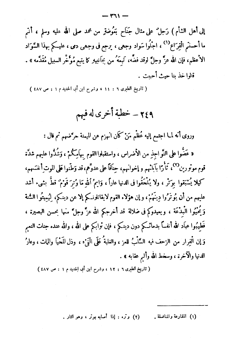 "تاريخ الطبري 6: 11، وشرح ابن أبي الحديد م 1: ص 487".